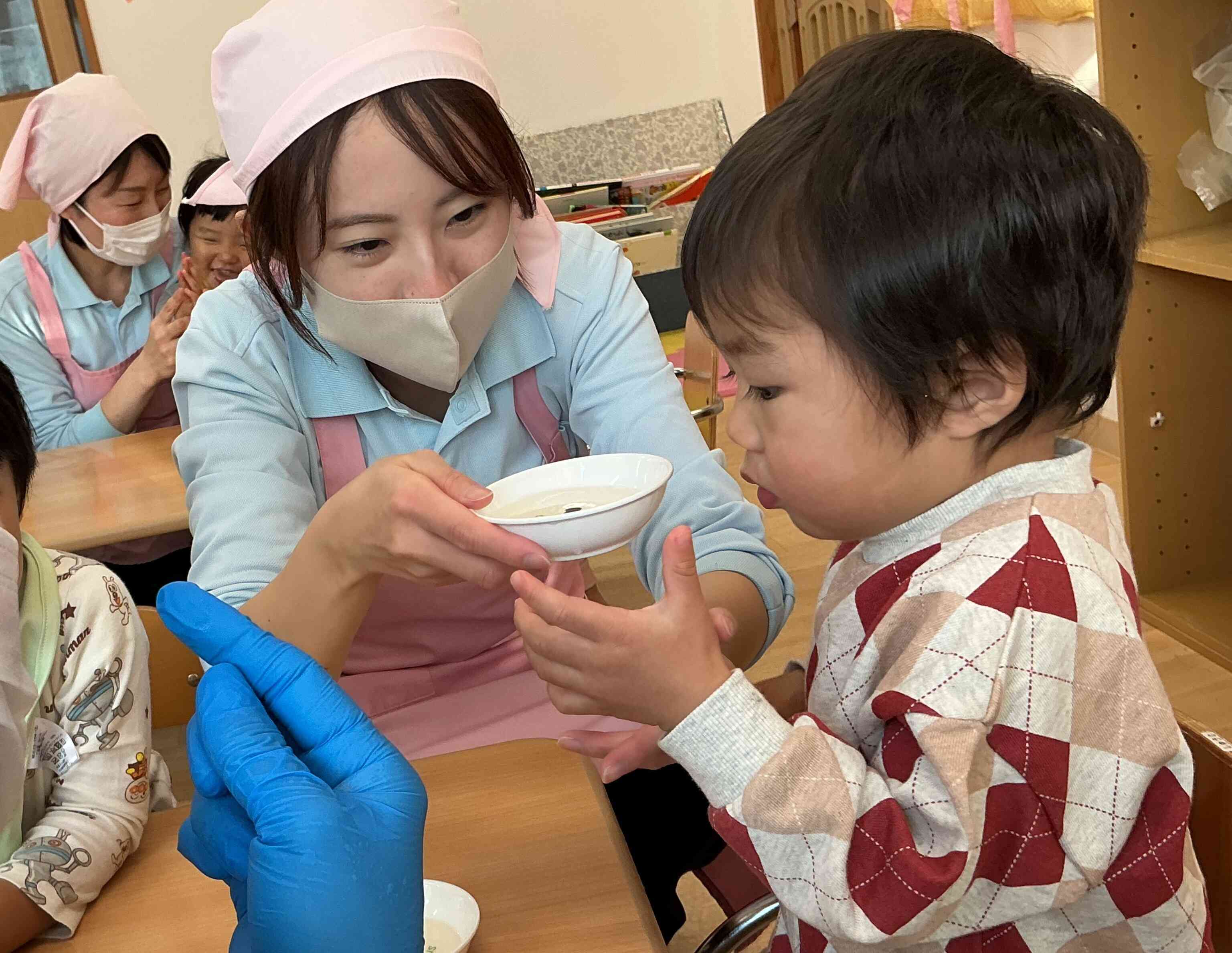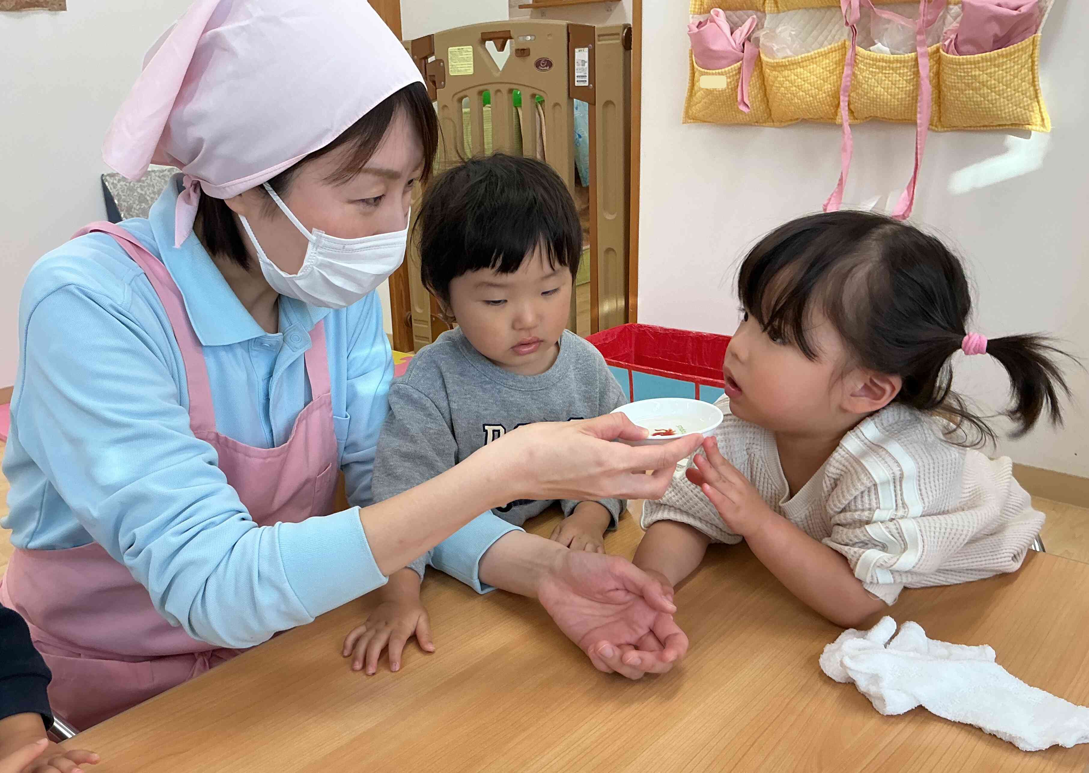 2歳児のお兄ちゃんお姉ちゃんが代表して、だしの飲み比べに挑戦です(*^^*)