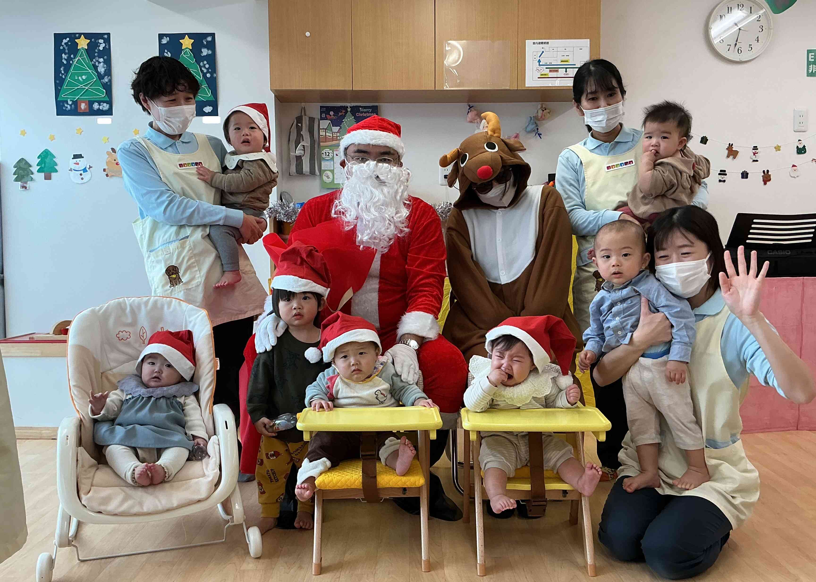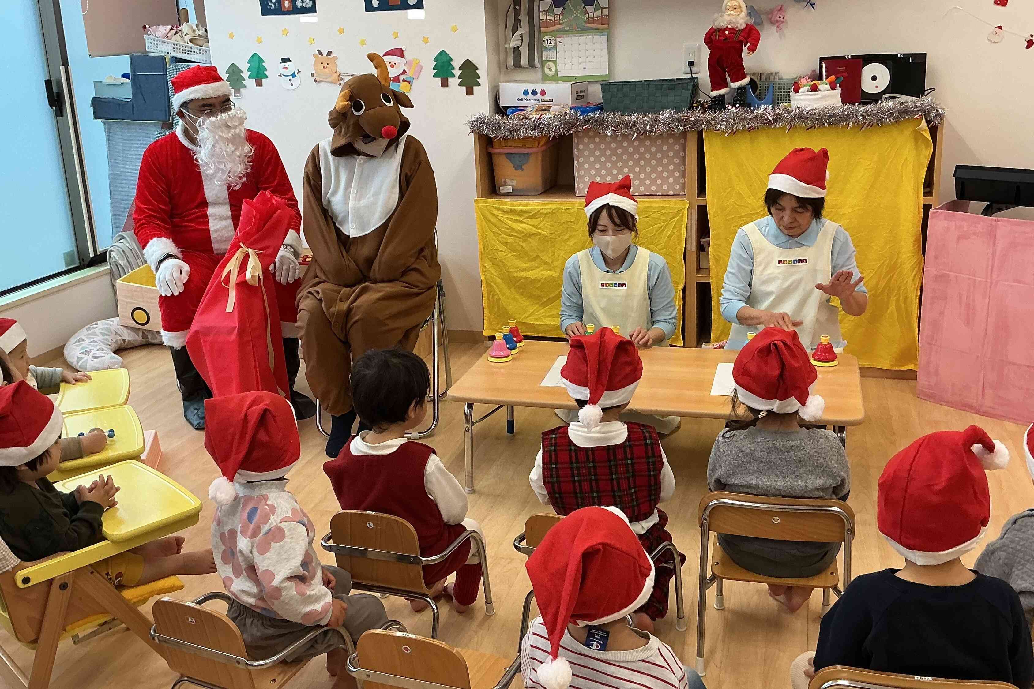 サンタ帽子を被ってクリスマス会の準備をしていると、鈴の音が・・・!