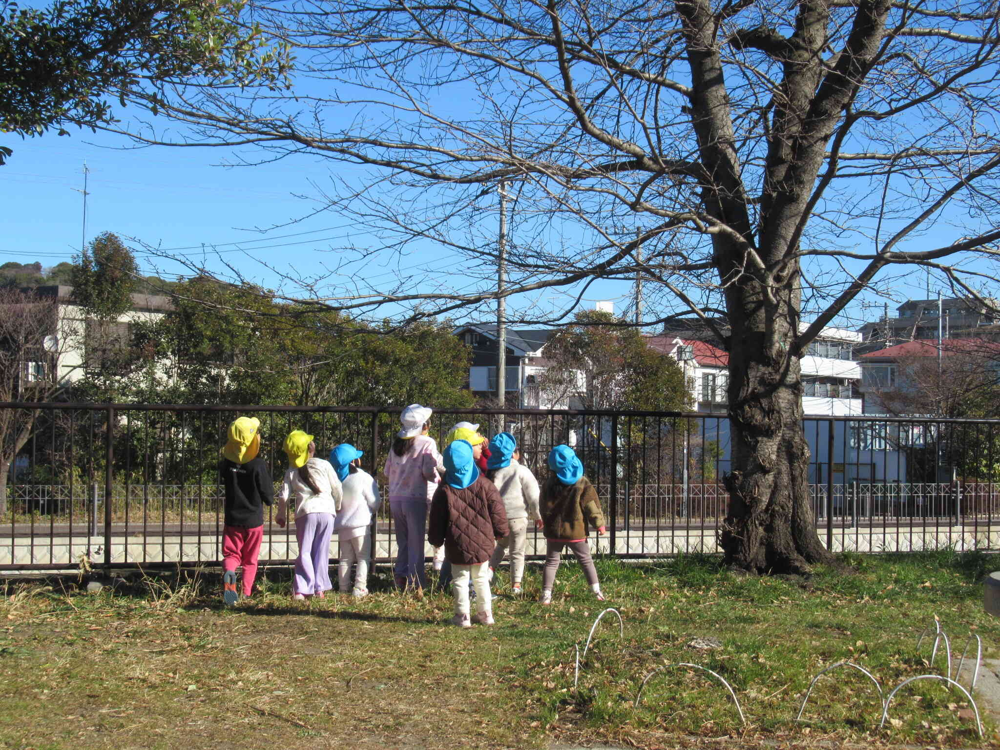 みんなで何かを見ています。鳥が飛んでいたのかな?不思議な形の雲があったかな・・?!