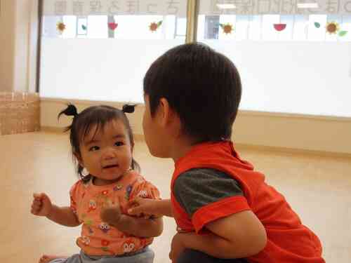 2歳児さんクラスのお友達が0歳児さんクラスのお友達に声をかけている様子も見られ、さまざまなかかわりを通して一緒に活動する楽しさを味わいながら過ごしています。