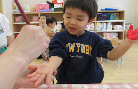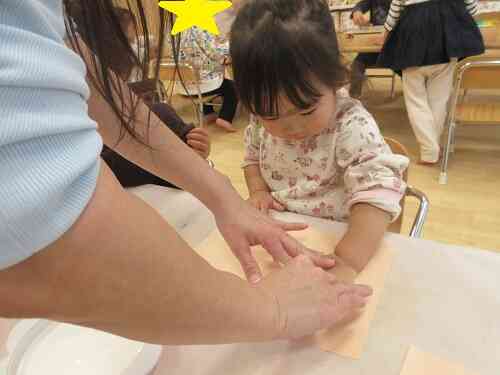 2歳児さんクラスはのりを使って飾りをはっていくよ~