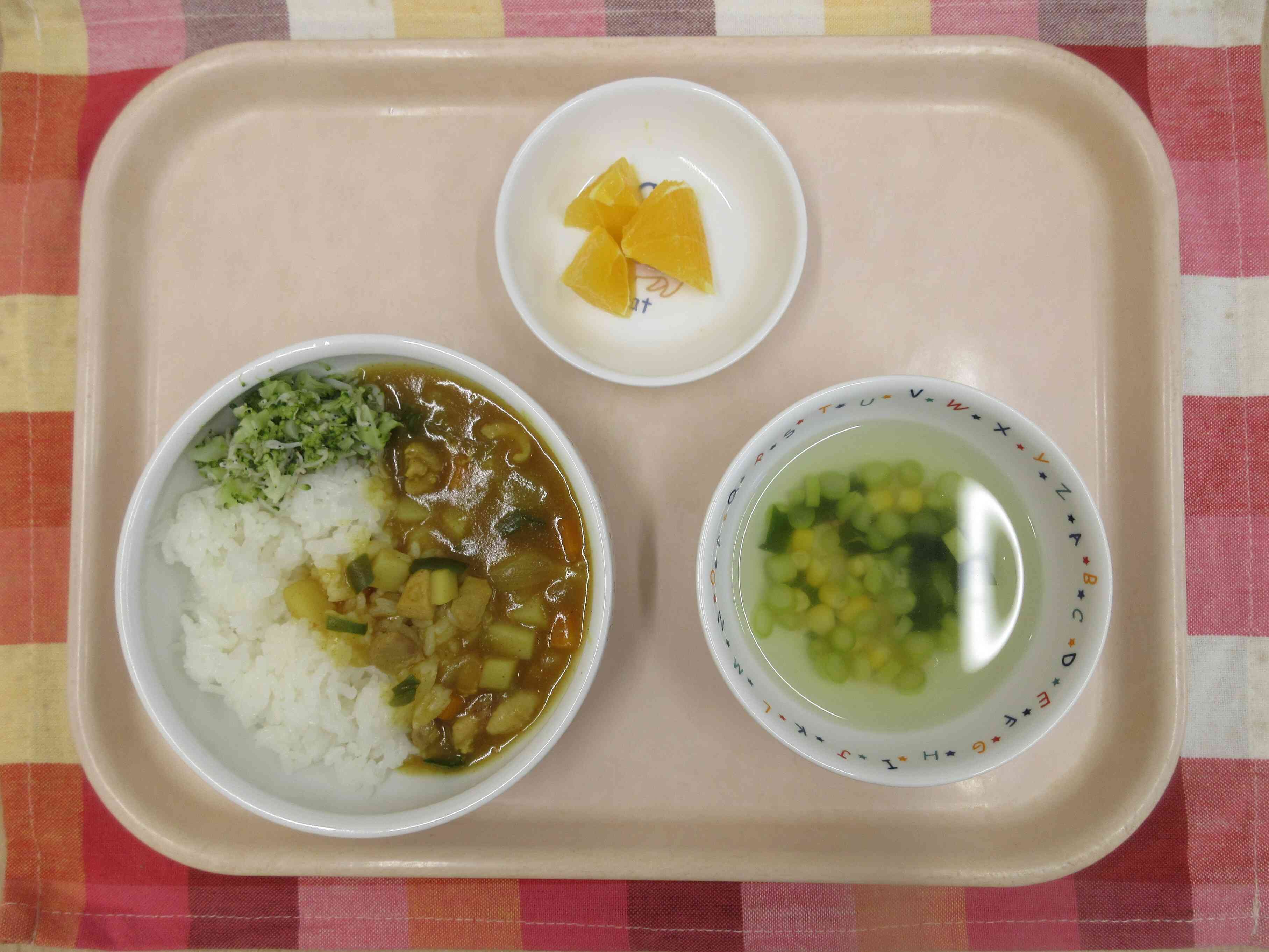 らっこちゃんごはん・さつま芋のおみそ汁・かれいのレモン揚げ・ピーマンのツナ和え・オレンジ お誕生会だったので、ご飯をらっこちゃんにしてみました! かれいのレモン揚げはさっぱりとしていて、夏にぴったりのメニューでした☆