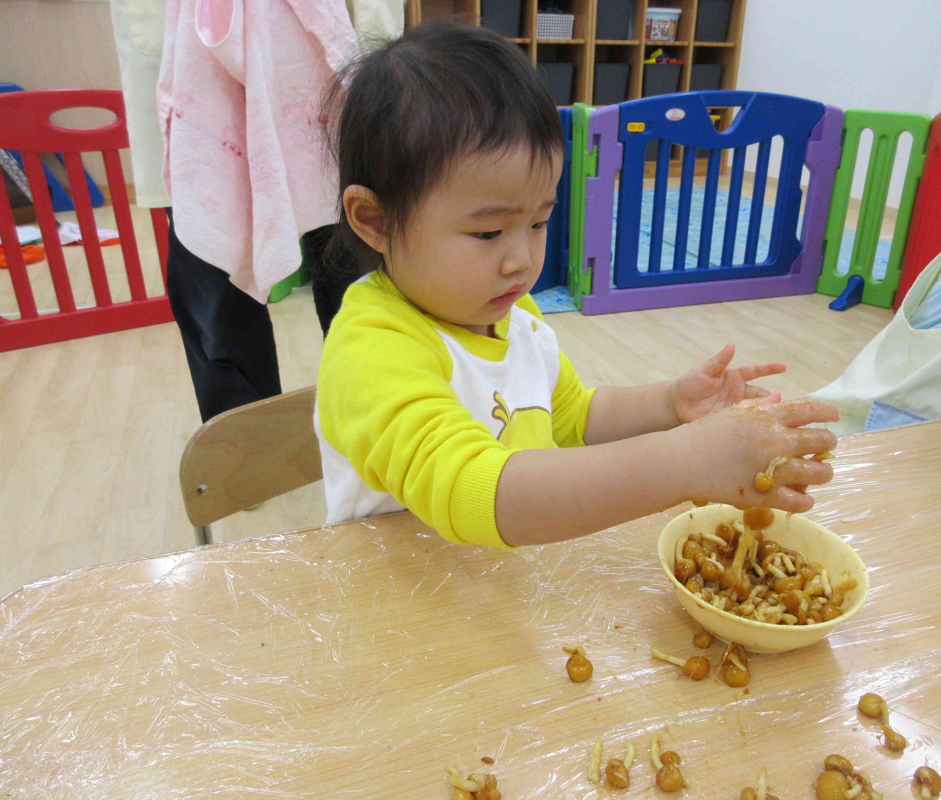 しめじや舞茸を小さくほぐしてじっくり観察したり「大きいしめじ見つけた!」と嬉しそうに教えてくれる姿も見られました。