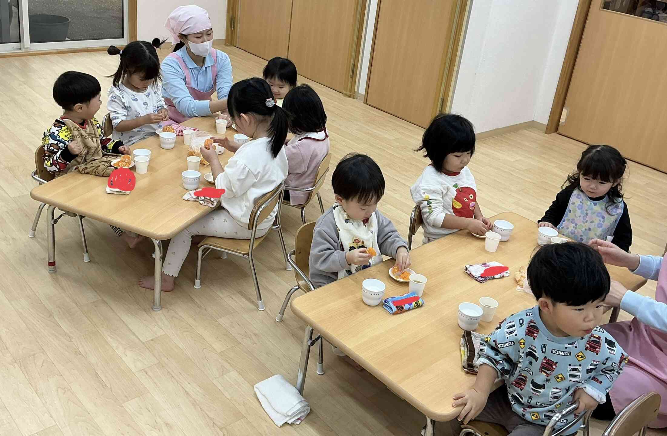 0歳児のお友達も参加しました。保育者に薄皮を剥いてもらい、一口サイズでいただきます!