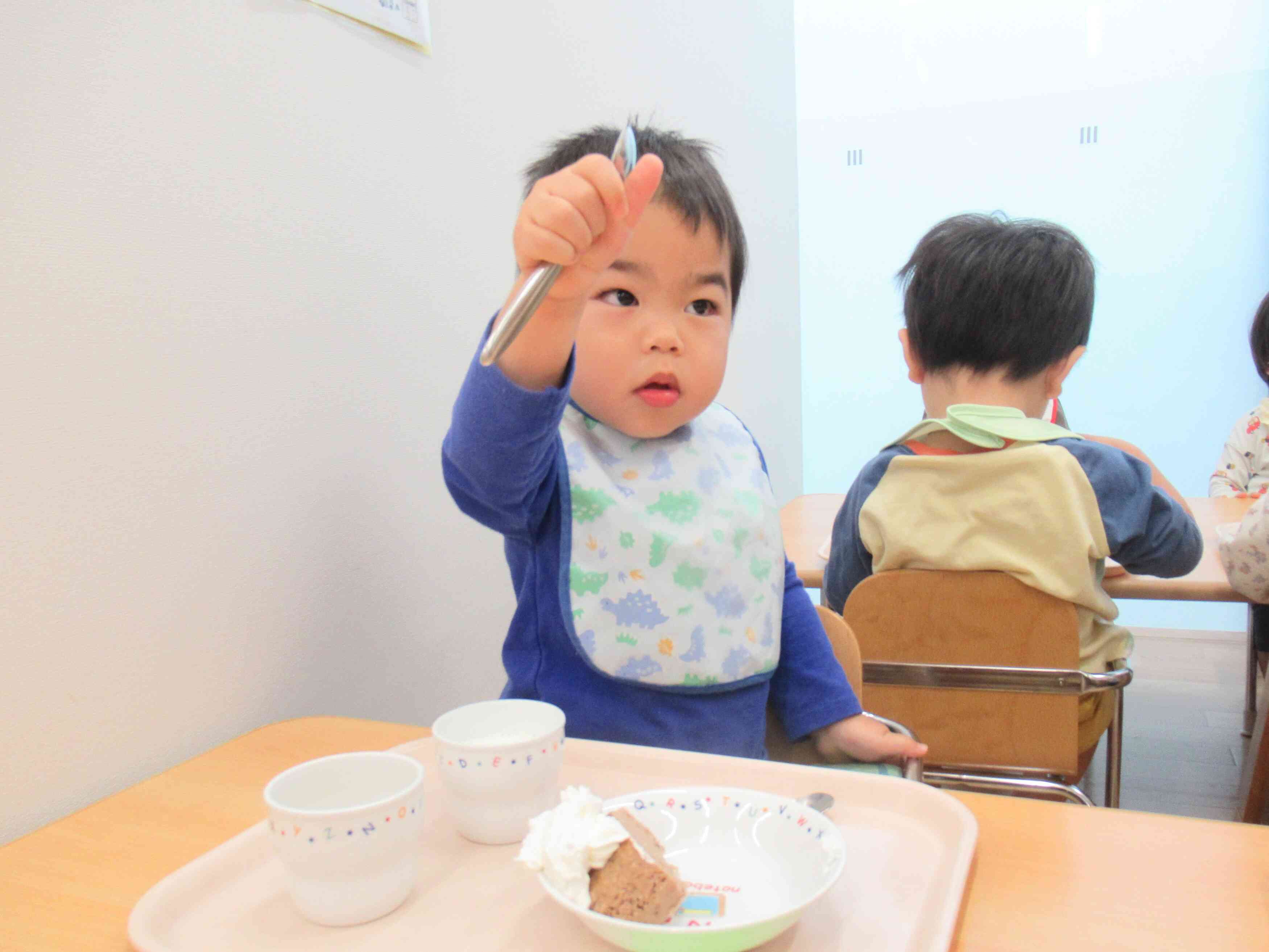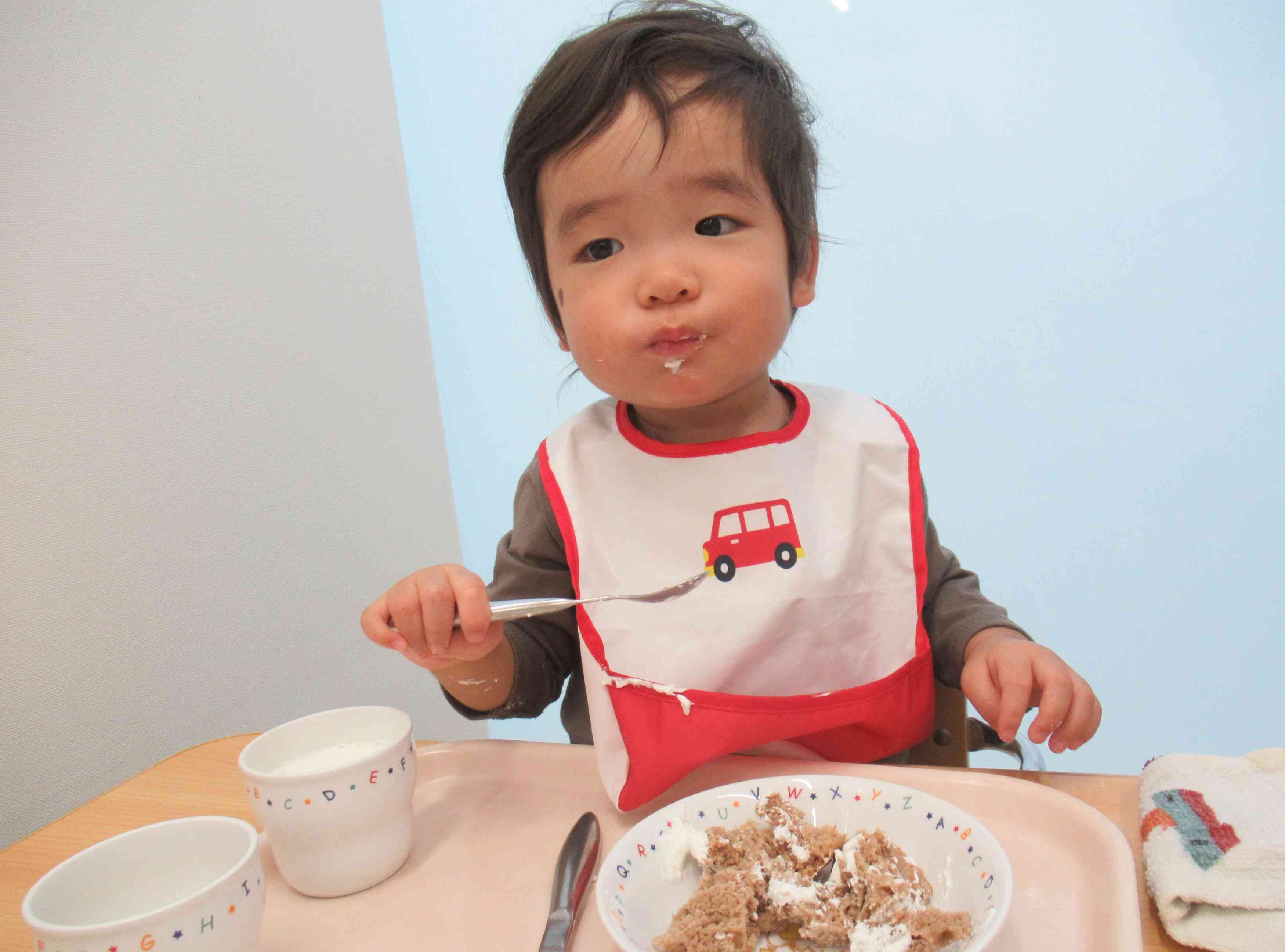 今日はお誕生日会があったので午後のおやつは「バナナココアケーキ」!
