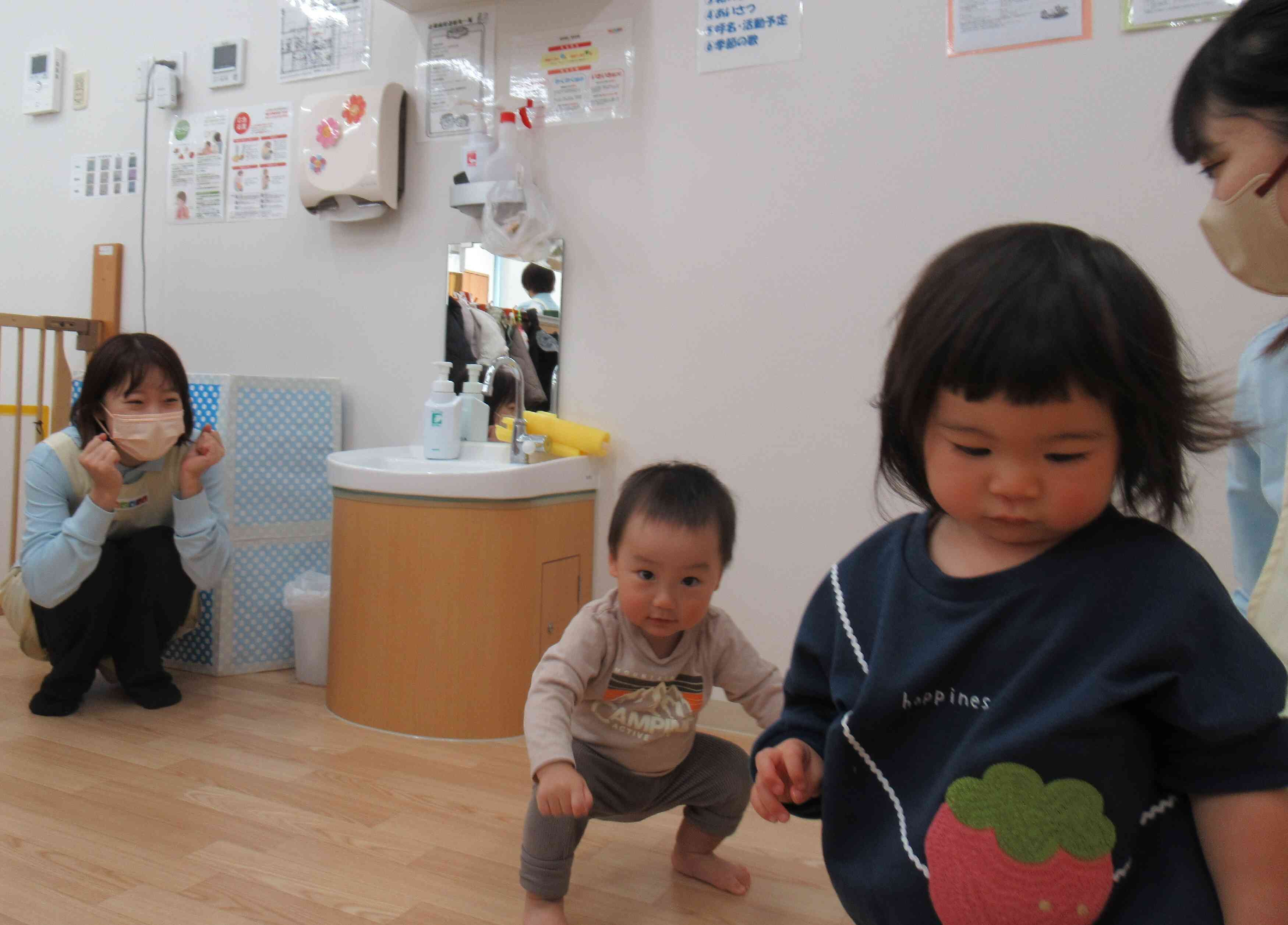 ♪こぎつねコンコン、やまのなかー!やまのなかー!♪に合わせてしゃがんだり小走りしたり。