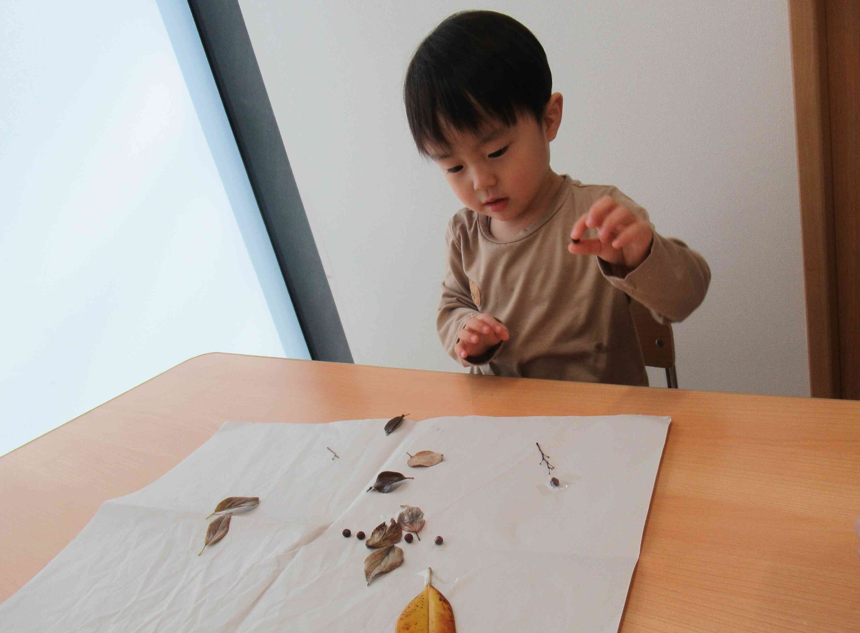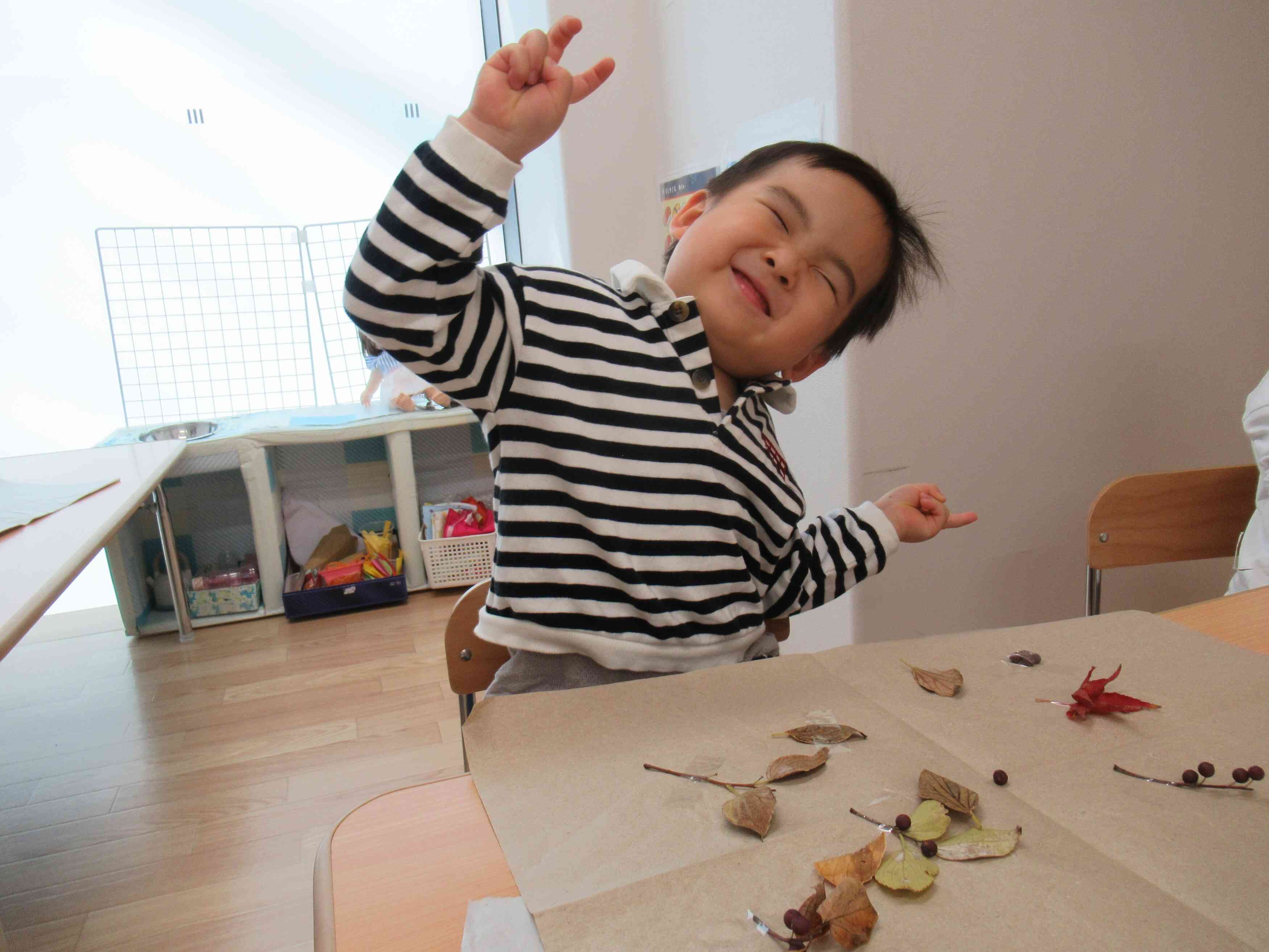 河川敷で拾ってきた落ち葉や木の実を画用紙へ貼りました♪