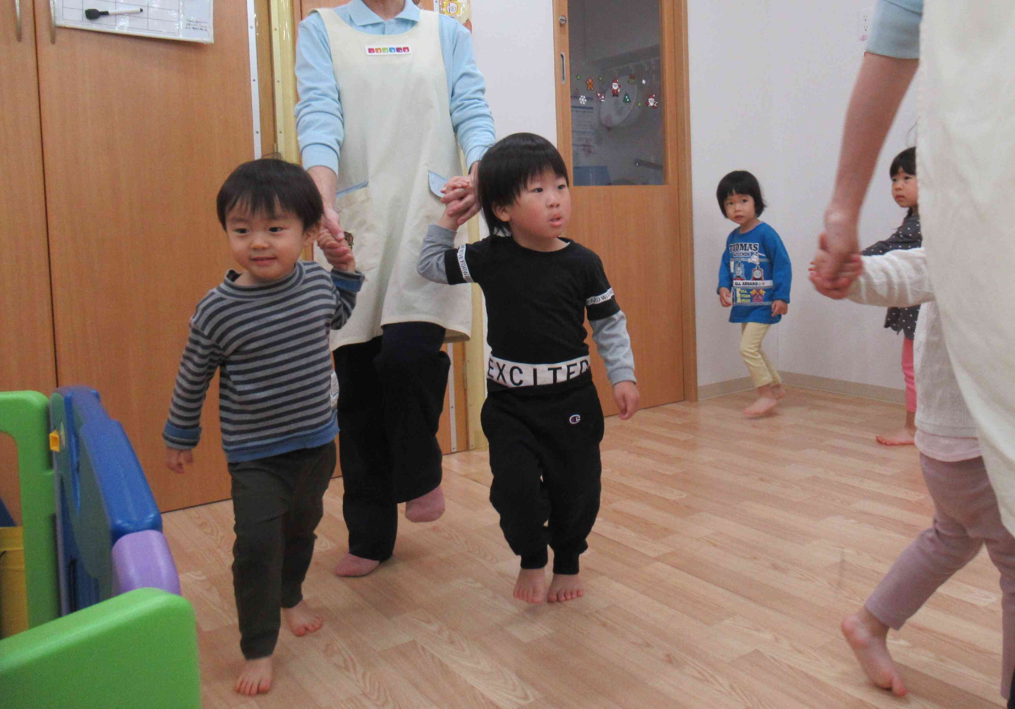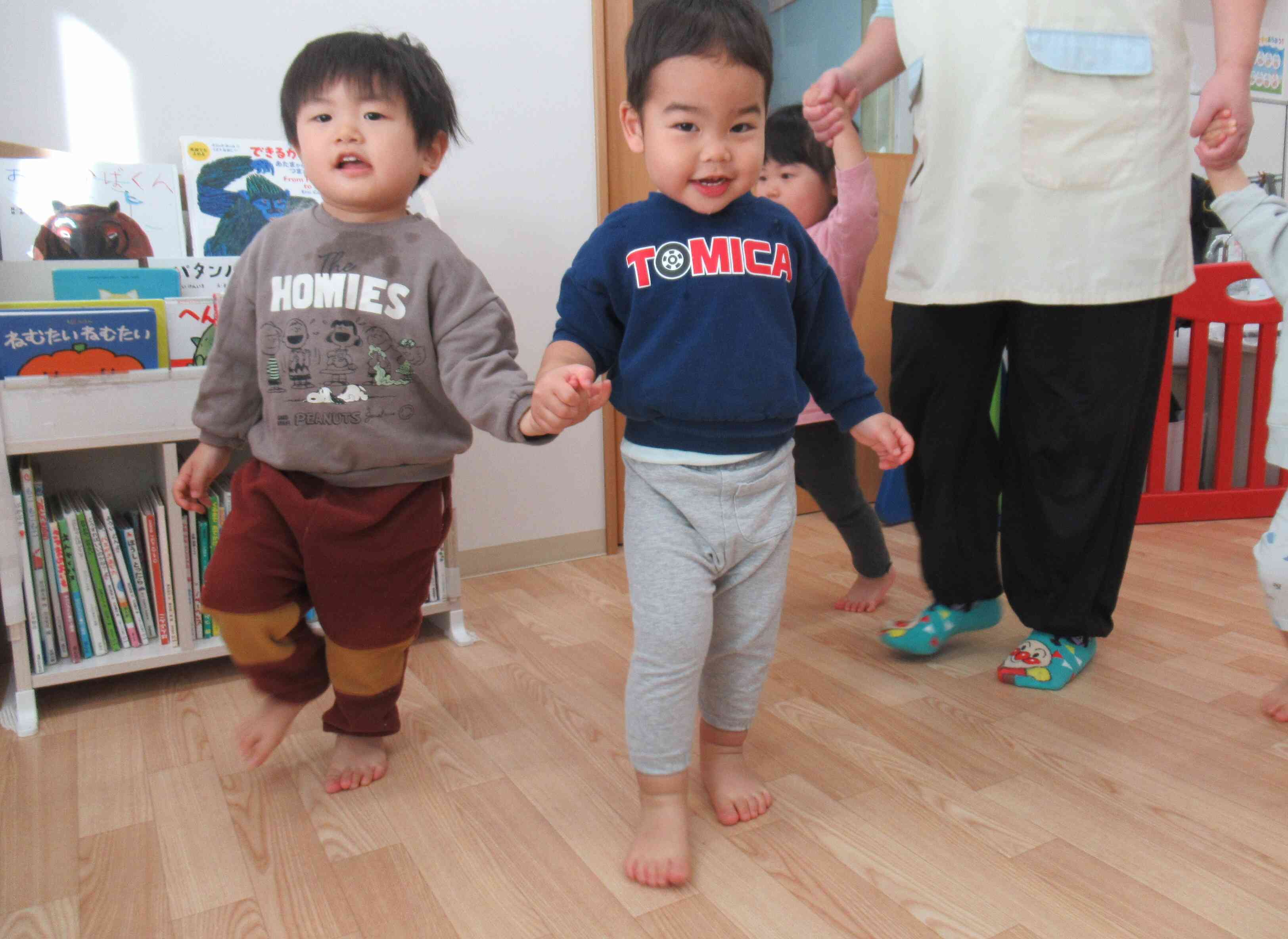 曲に合わせて動いて、お友だちや保育者と握手でギュッギュッギュー♪