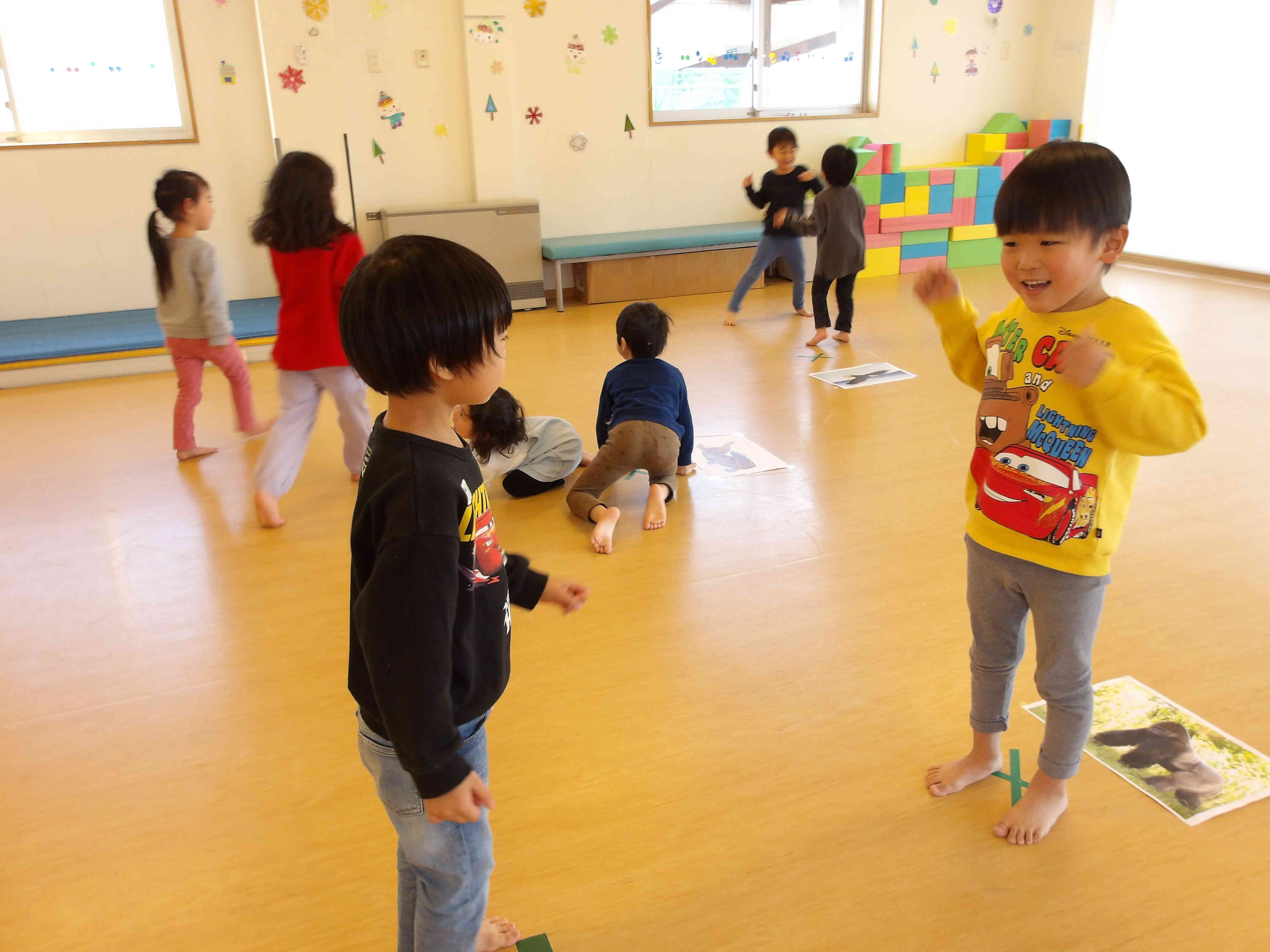 動物園のお客さんと動物チームに分かれて、お客さん役に変身したポーズを見てもらいました。「似てるね!」「○○はこうやっているの知ってる」とイメージした動物たちの様子を伝え楽しんだ子どもたちでした。