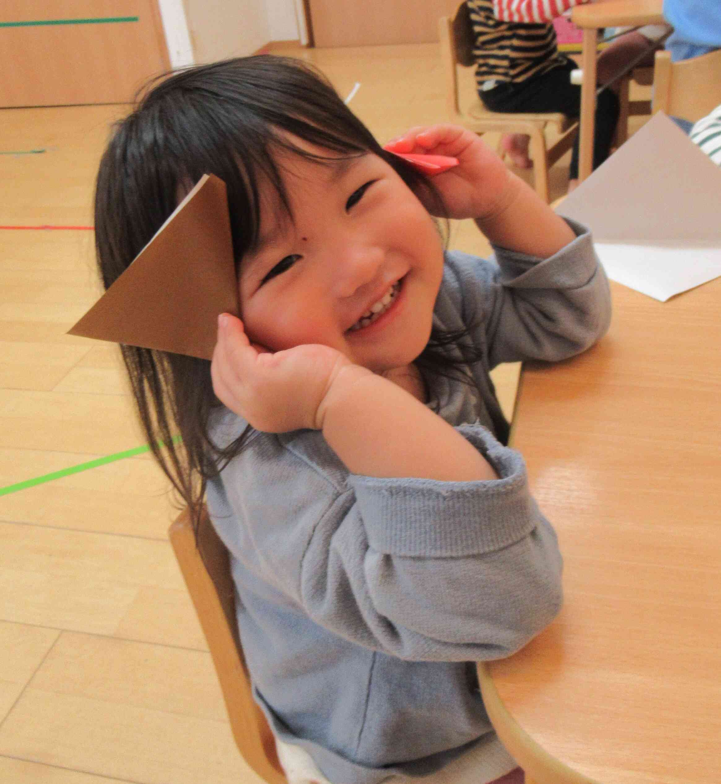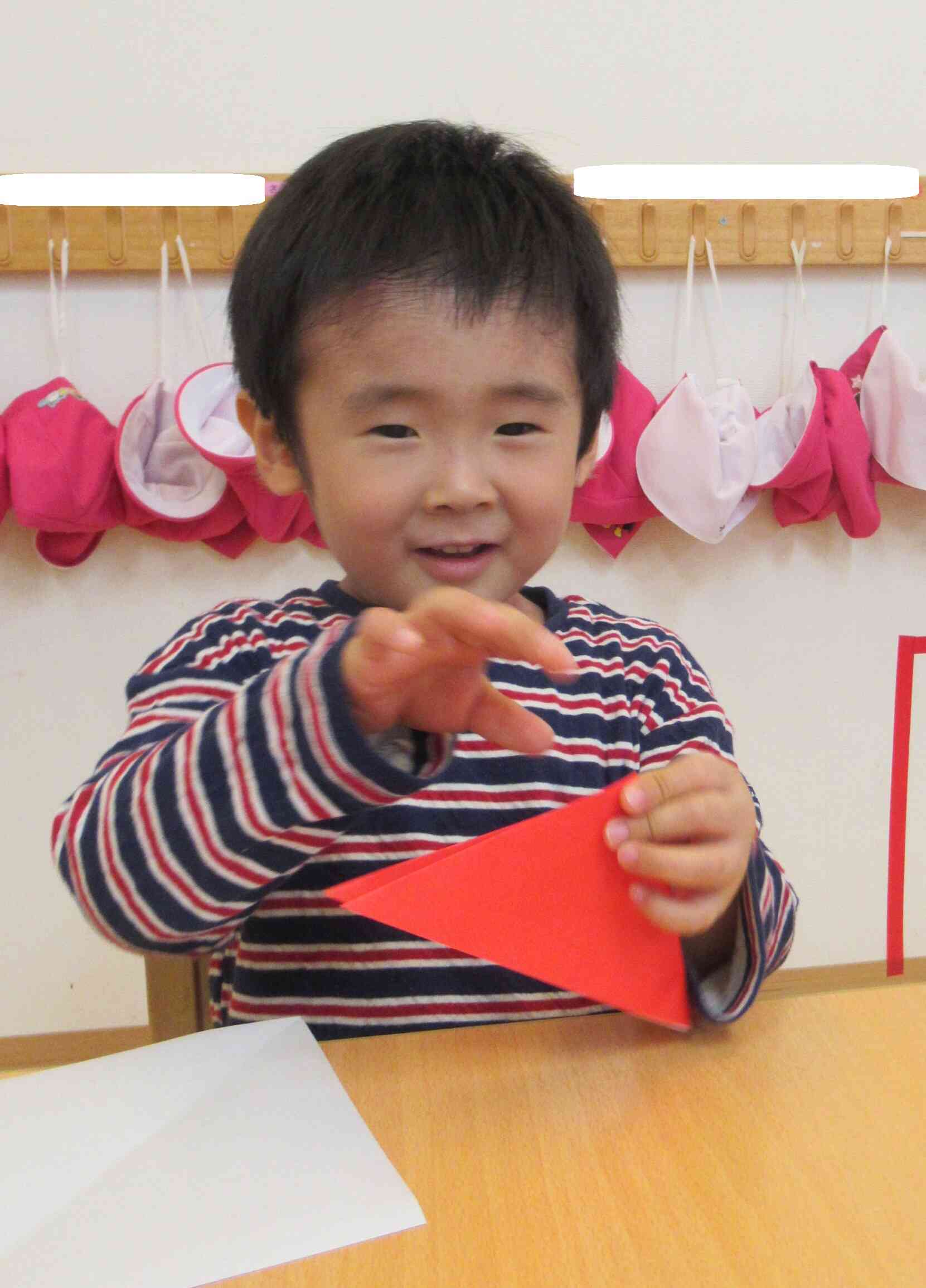 折り紙の端を合わせて、三角の形に折ってみました。お友だち同士で出来た物を見せ合いっこをしながら、集中して取り組んでいましたよ。