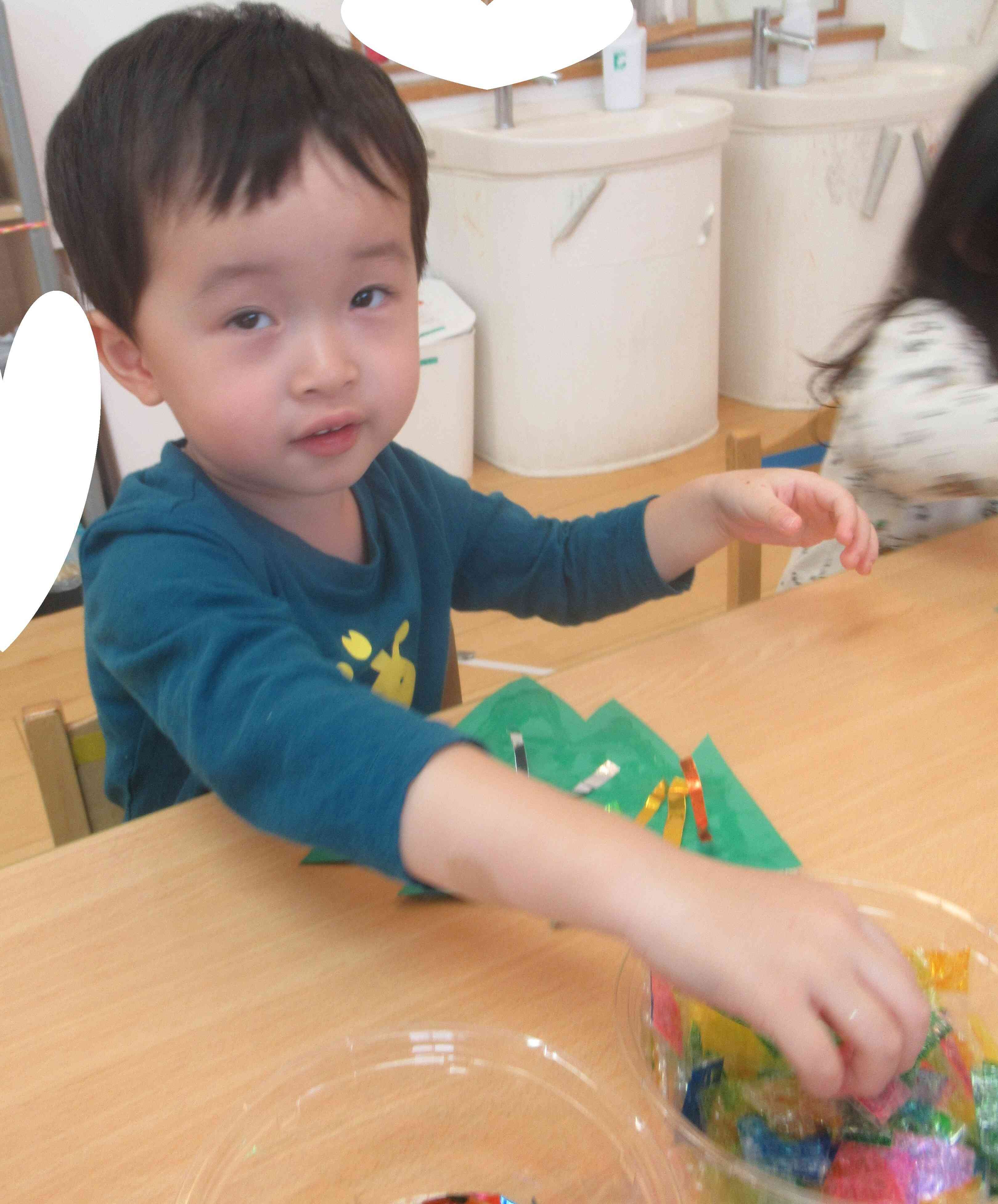 キラキラな折り紙をクリスマスツリーに飾りつけしました。表と裏で違う色だと気が付くと、どちらを見えるようにしようか、考えながら貼っていましたよ。