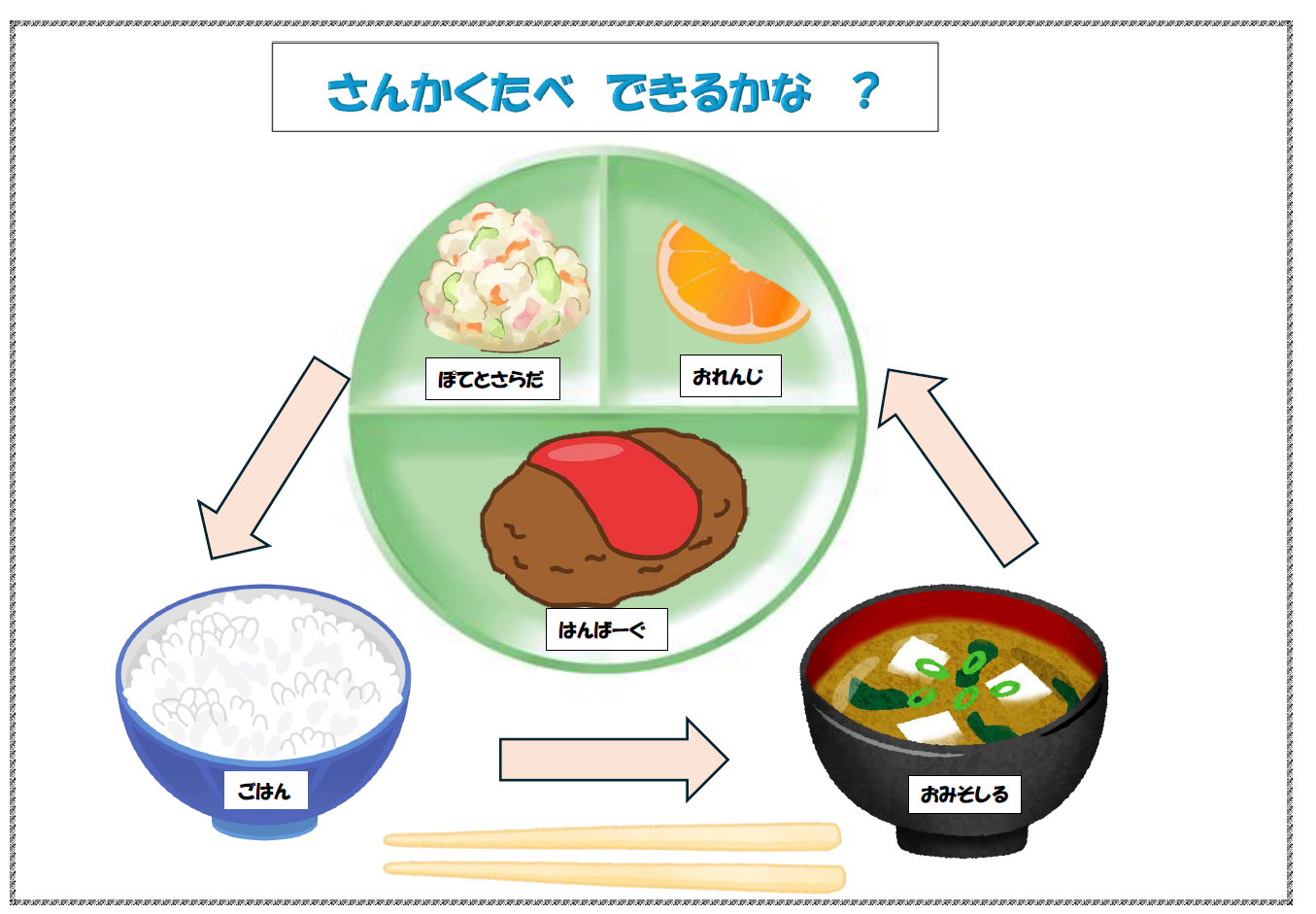 一人一人に三角食べのポスターを配ると、お箸を持って「おかず」「ごはん」「お味噌汁」の順番で三角に食べるように説明をします。子どもたちの好きなメニューだったので、「お腹がすいたよ~」と言いながら三角食べの練習をしました。