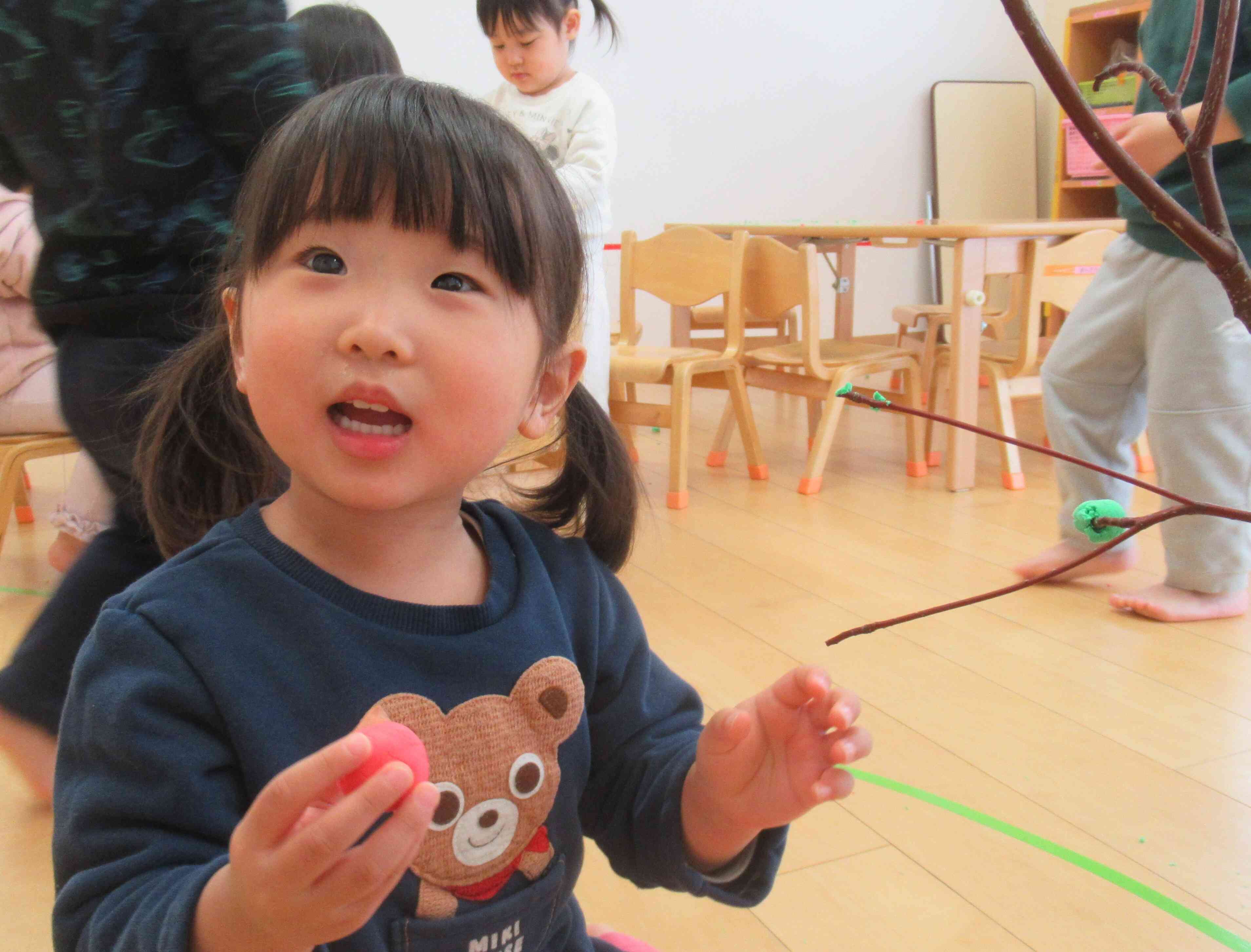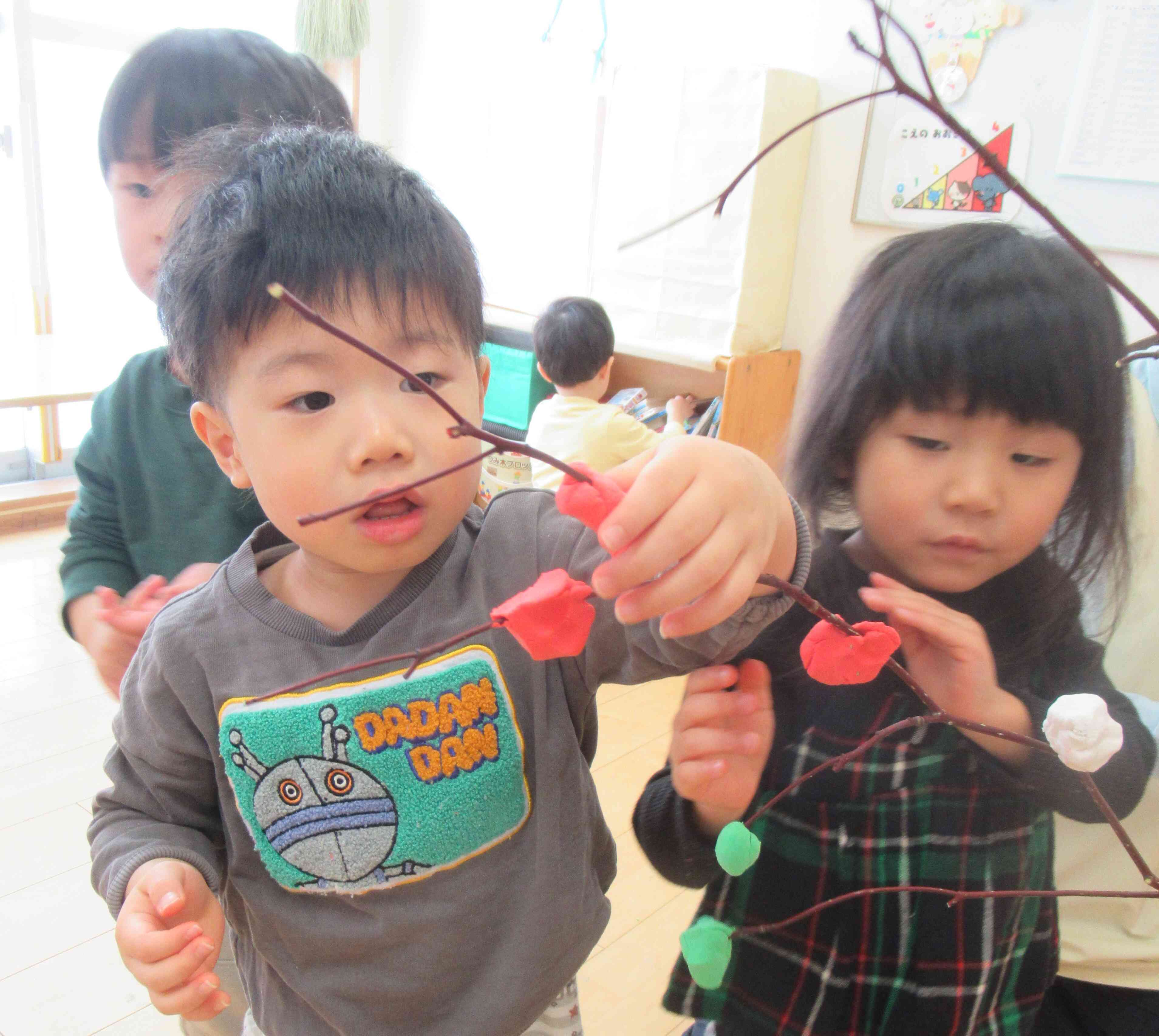 たくさん作ったお団子を木に飾り付けました。そーっと枝にくっつけると「できた!かわいい~」と大喜びの子どもたちでした。