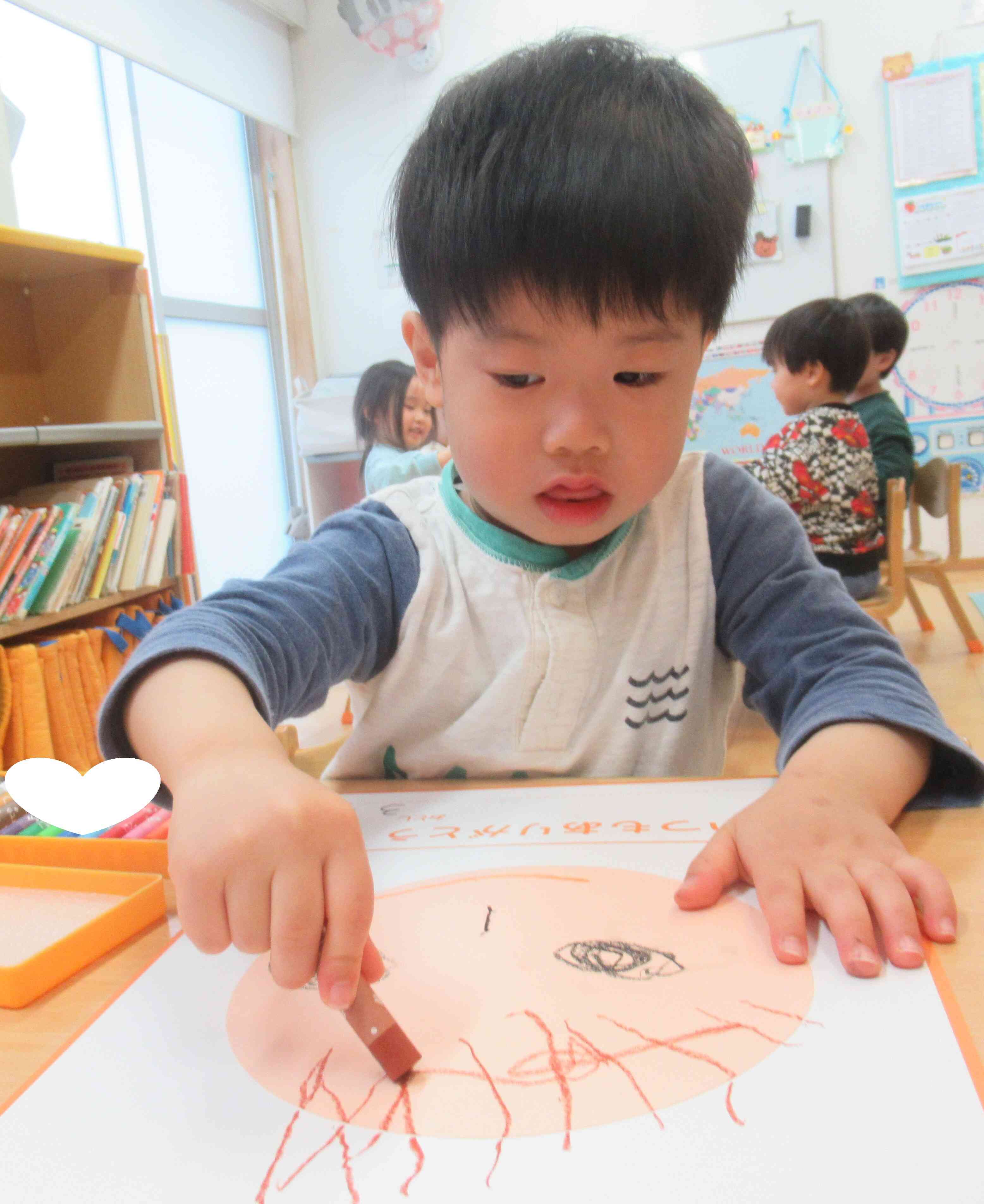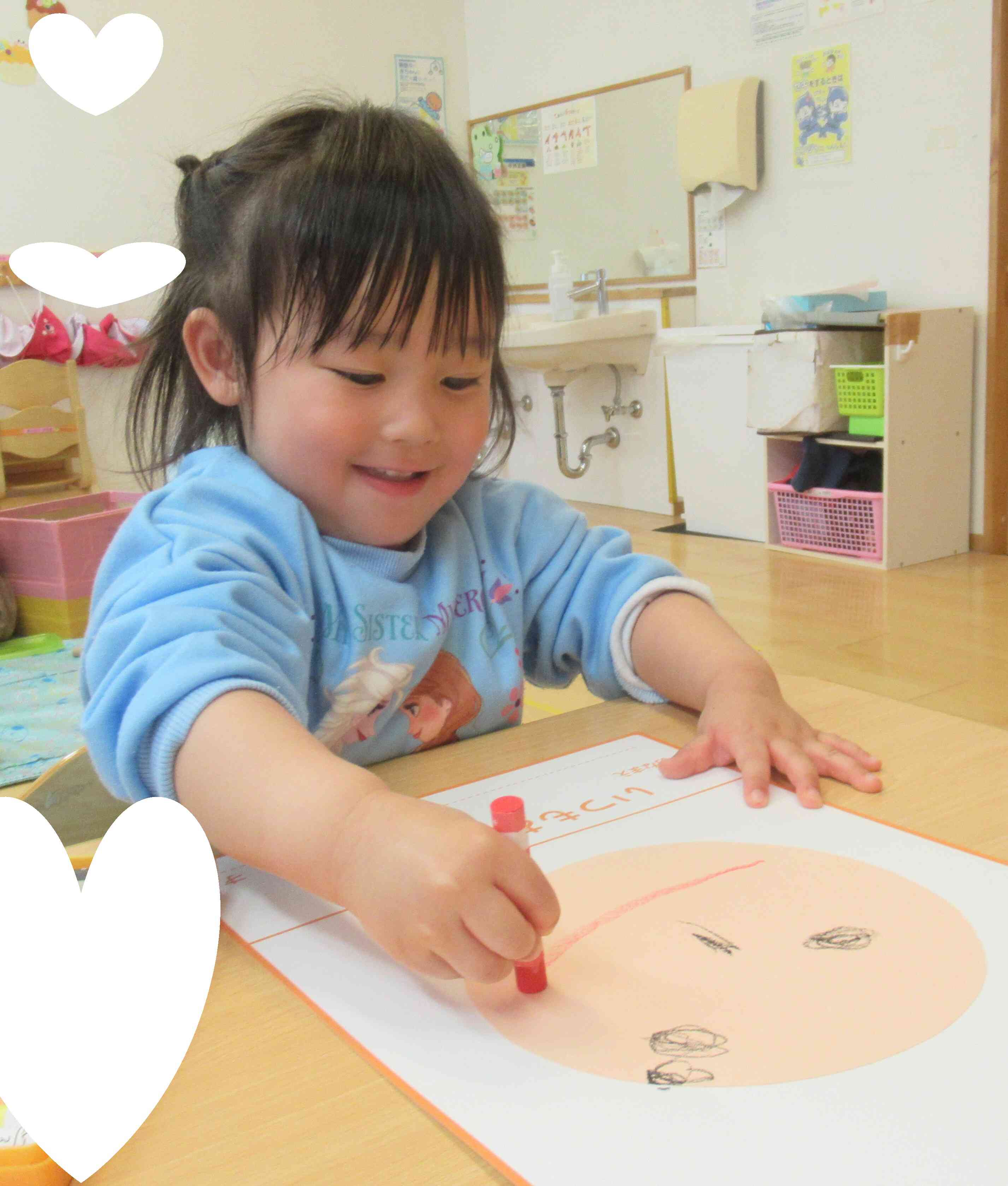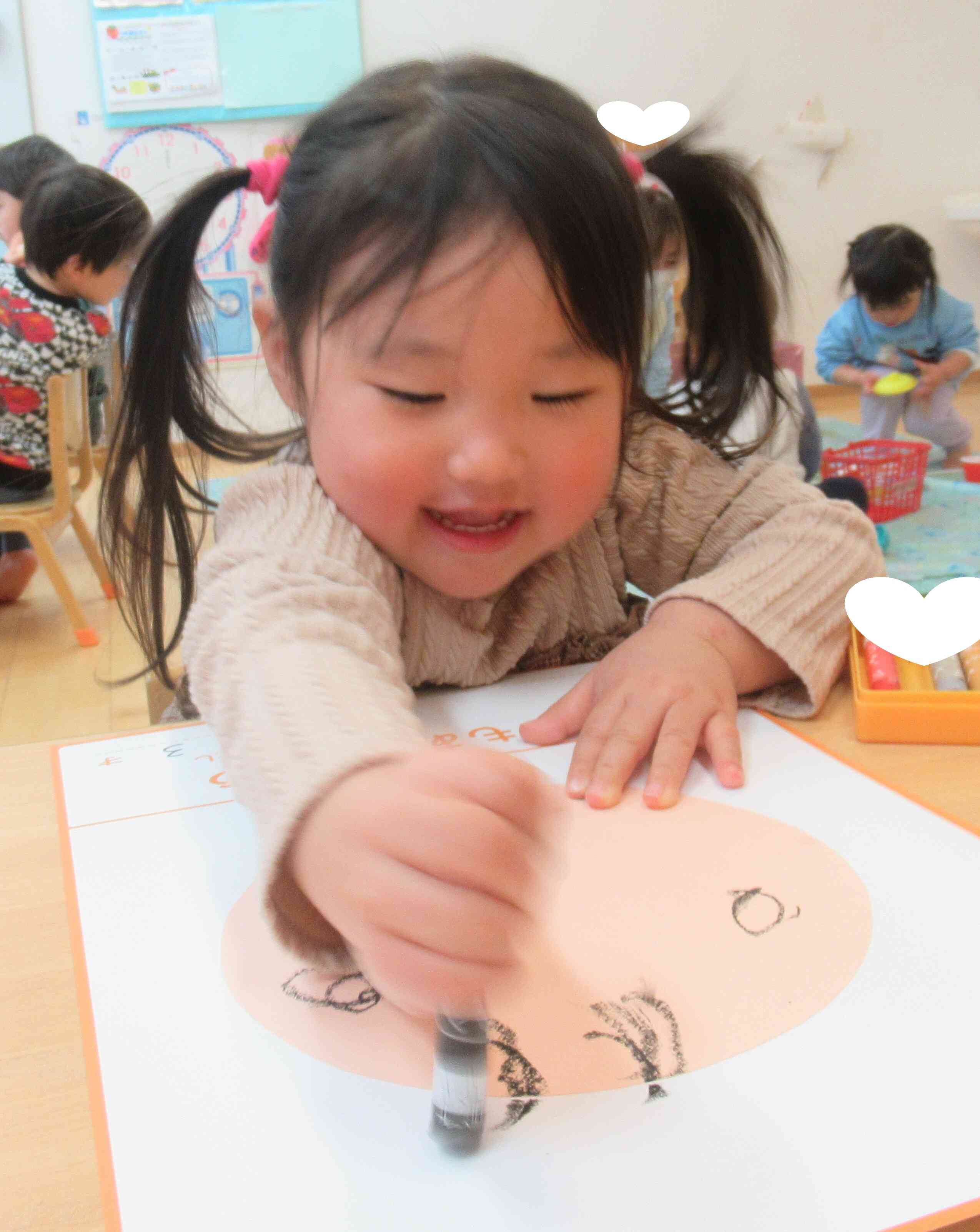 お顔の形を話しながら描き進めました。丸いかな、大きいかな、にっこりのかたちは?と一生懸命に考えていましたよ。
