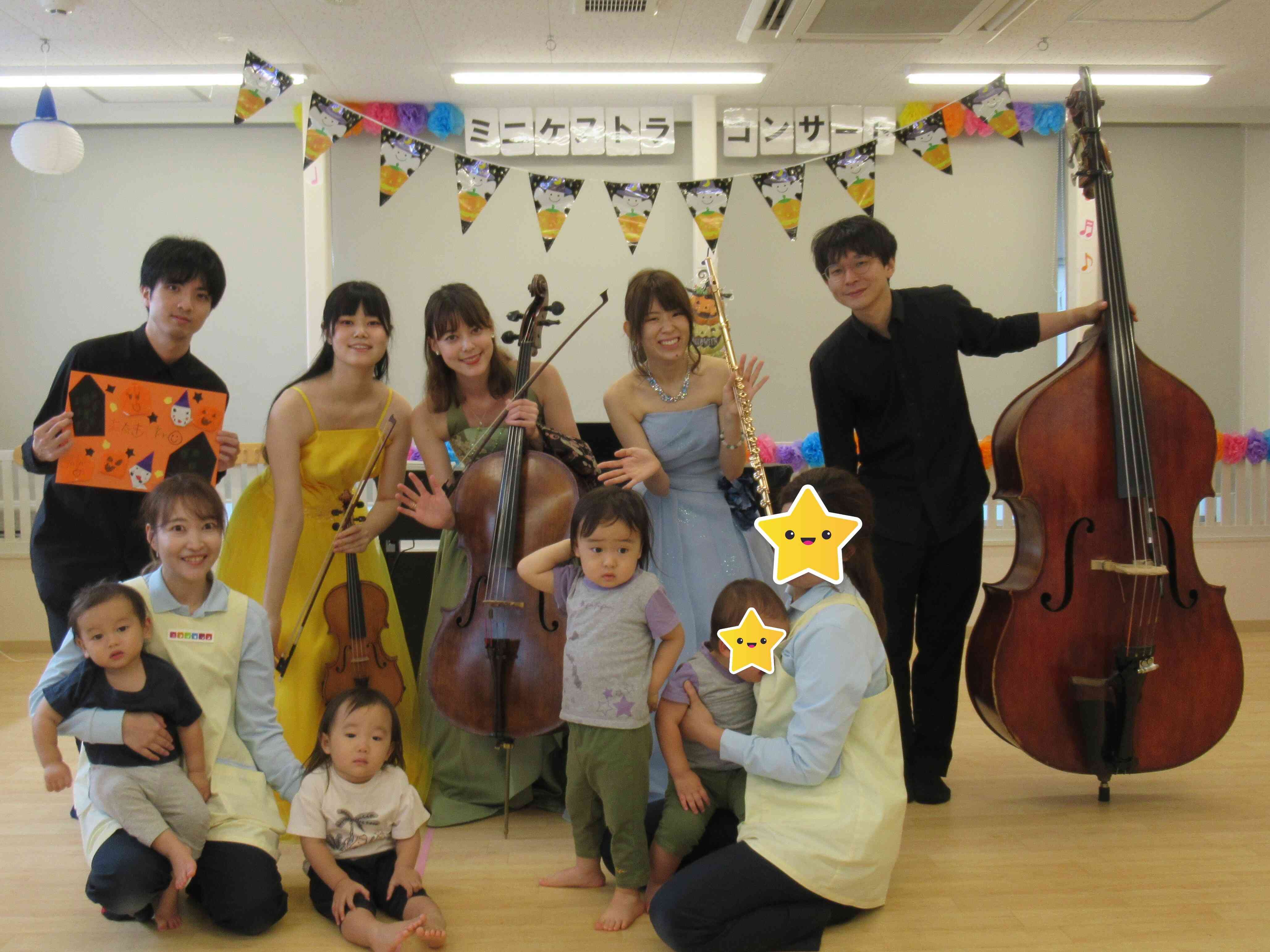当日は本物の楽器での生演奏を聴いて、0歳児さんは心地よい音を聴きながら眠る子どもがいたり、3.4.5歳児さんは素敵な演奏に聴き入っていました。地域の皆さまにもいらしていただいて、みんなで一緒に指揮者体験をしたりと参加型の楽しいコンサートでした。