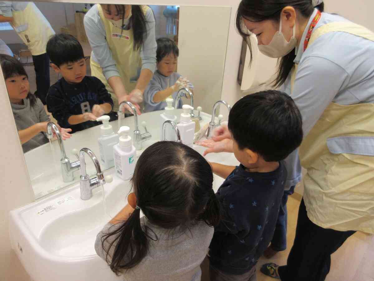 芝公園から帰ってきていつものように手を洗った園児たち。