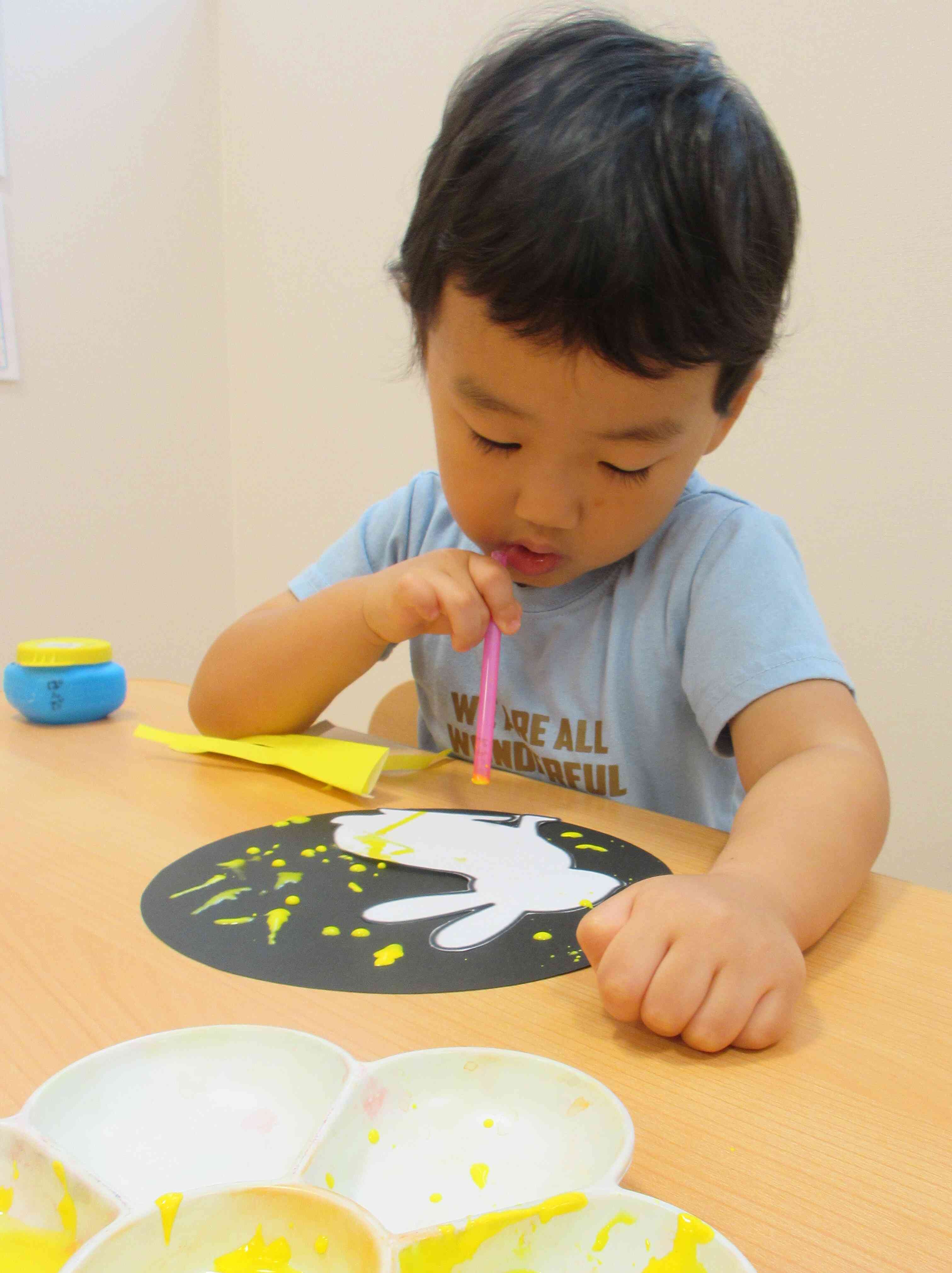 3歳の子どもたちは、吹き絵で月に色を付けました。