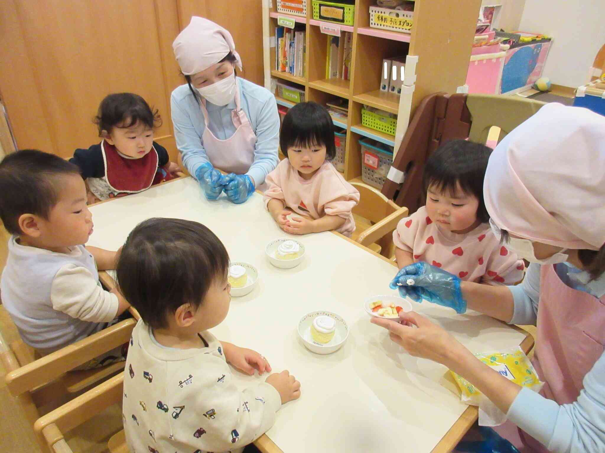 最初に『フルーツケーキいただきます』という絵本を読んでから、ケーキの飾りつけをしました。