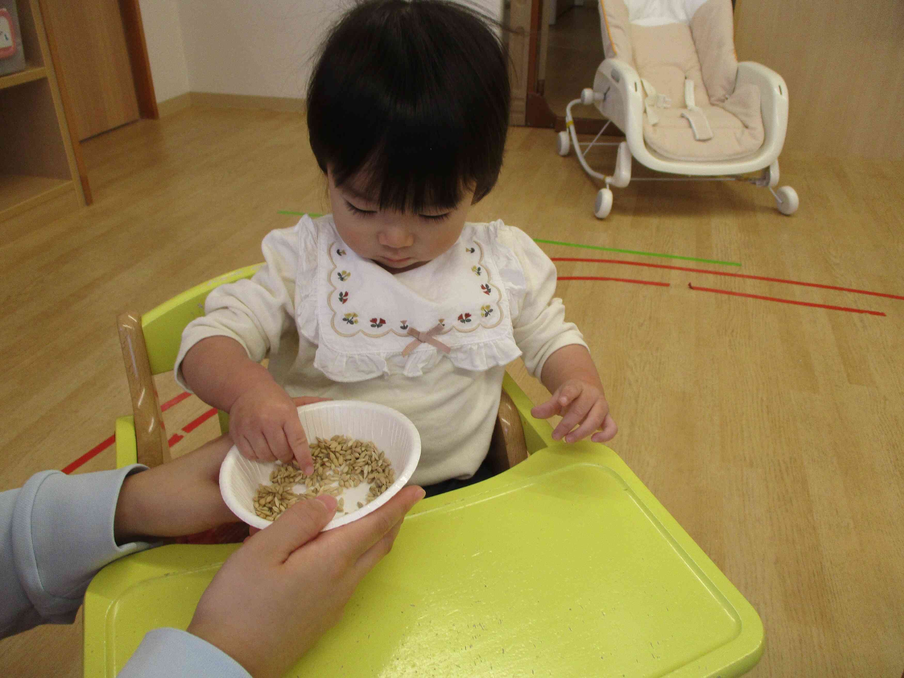 実際の稲も観察し、籾のついたままのお米を触ってみました。感触はどうかな?