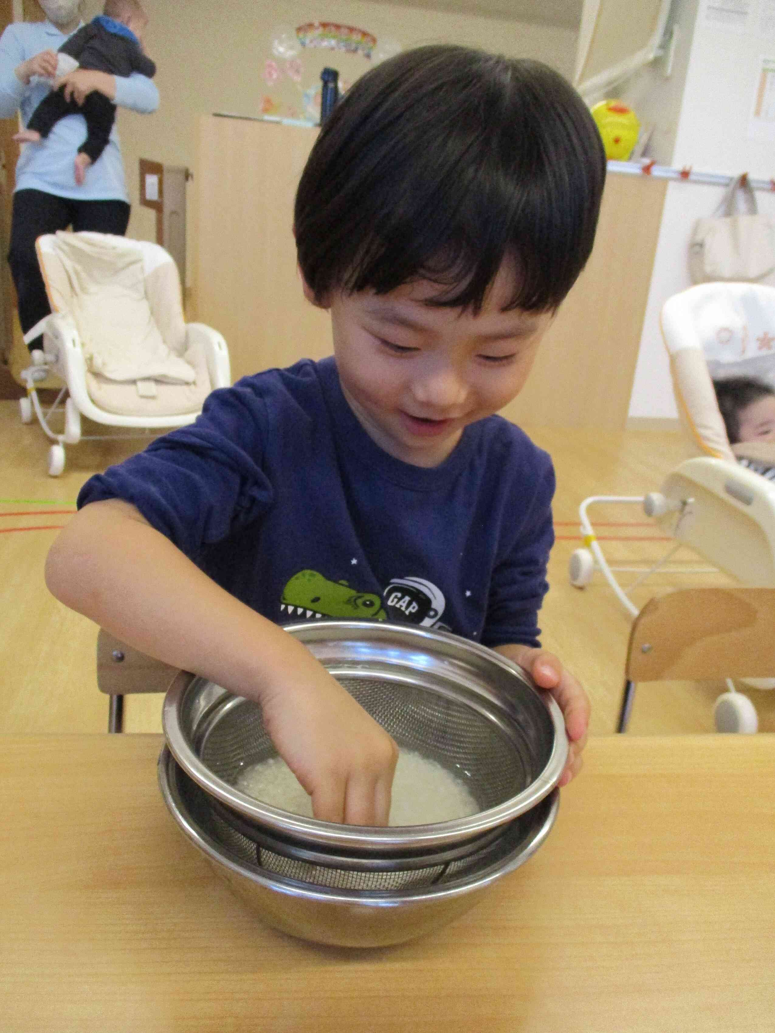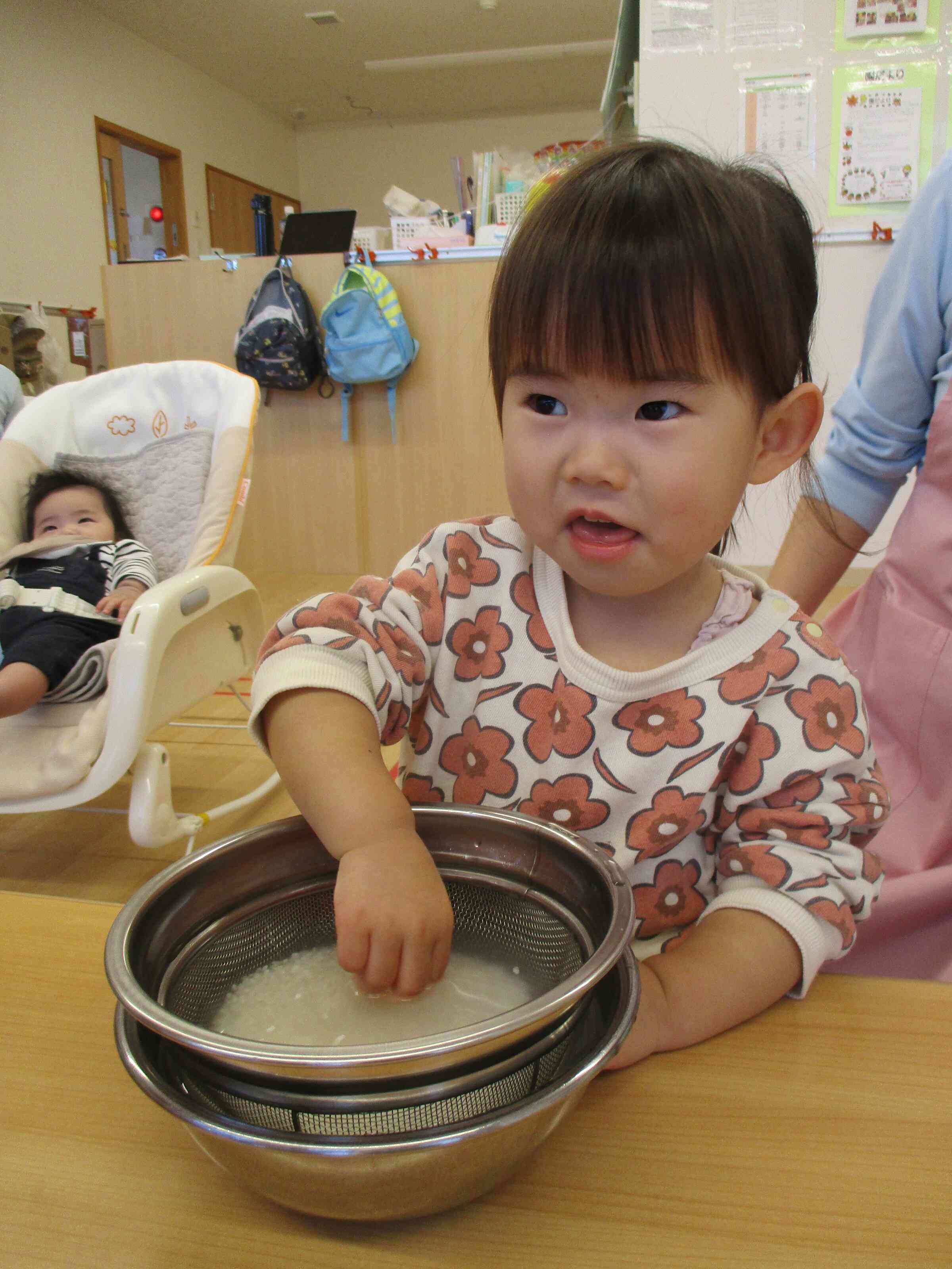 精米されたお米は繊細です。強く研ぐと美味しくご飯が炊けません。みんな、そっと手を入れて、優しく混ぜ混ぜしていました。