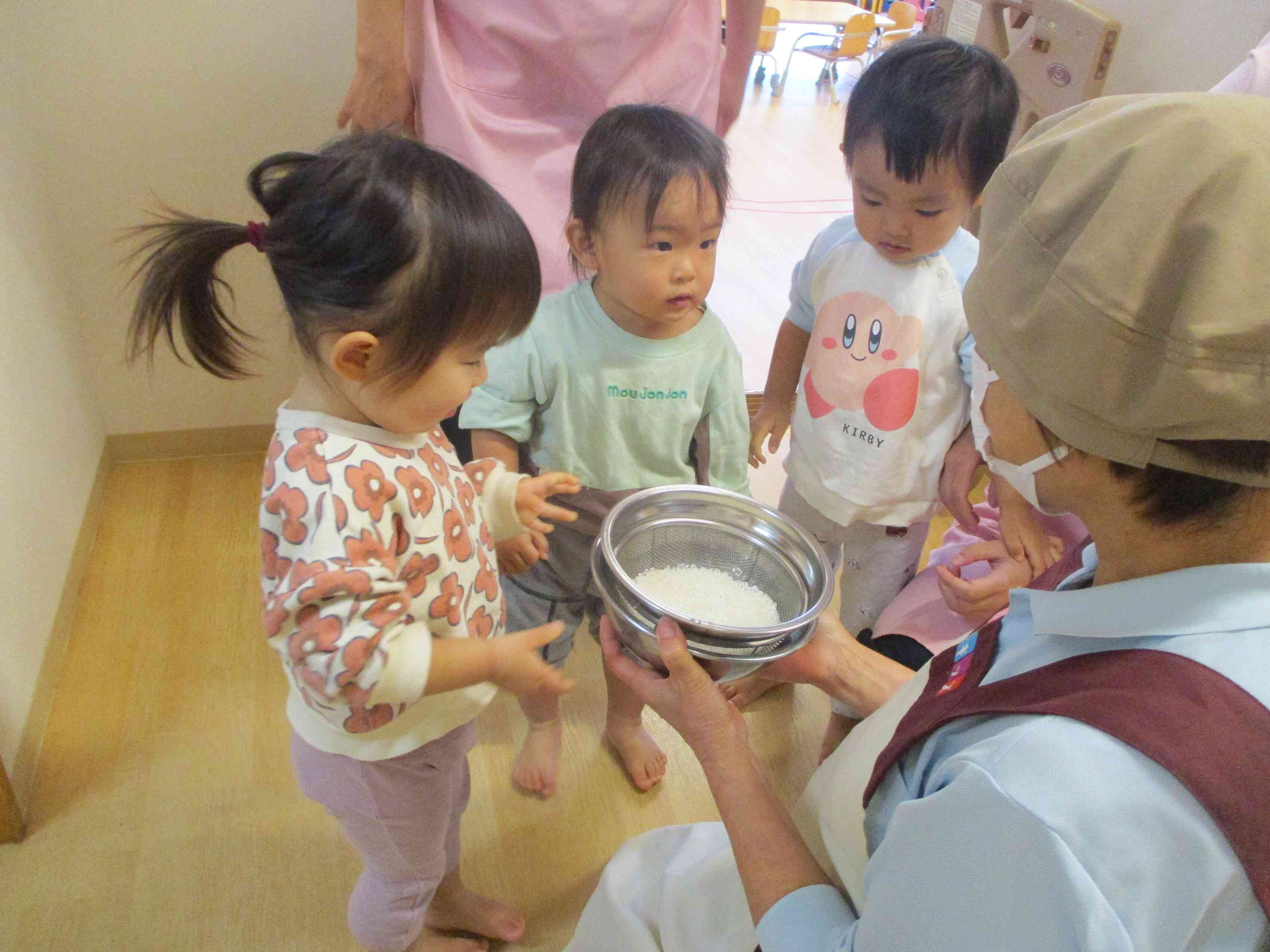 今月の食育集会では、お米について学び、給食で提供されるご飯のお米研ぎを体験しました。