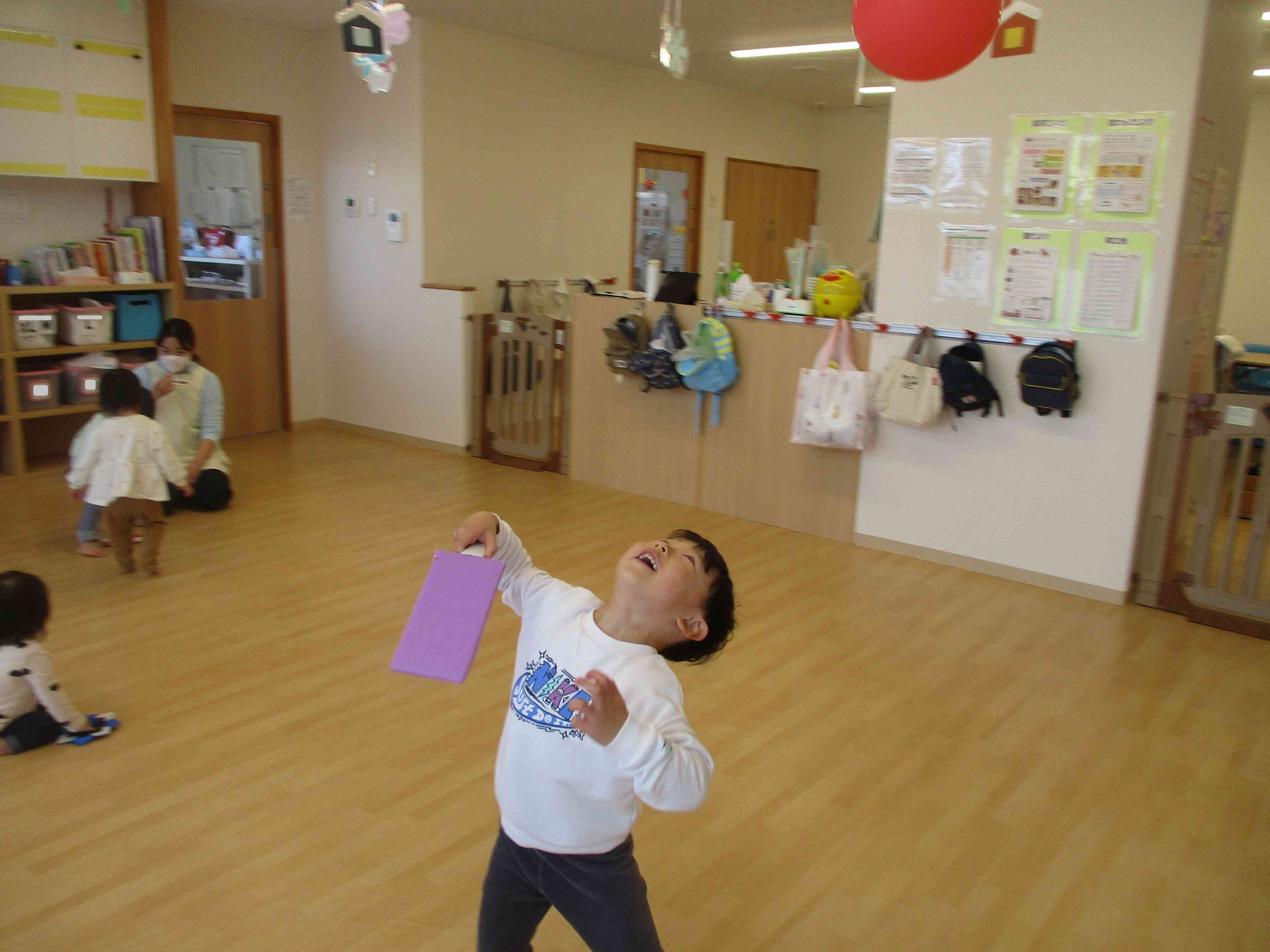 保育士お手製の羽子板を使って、羽根つきをしました。