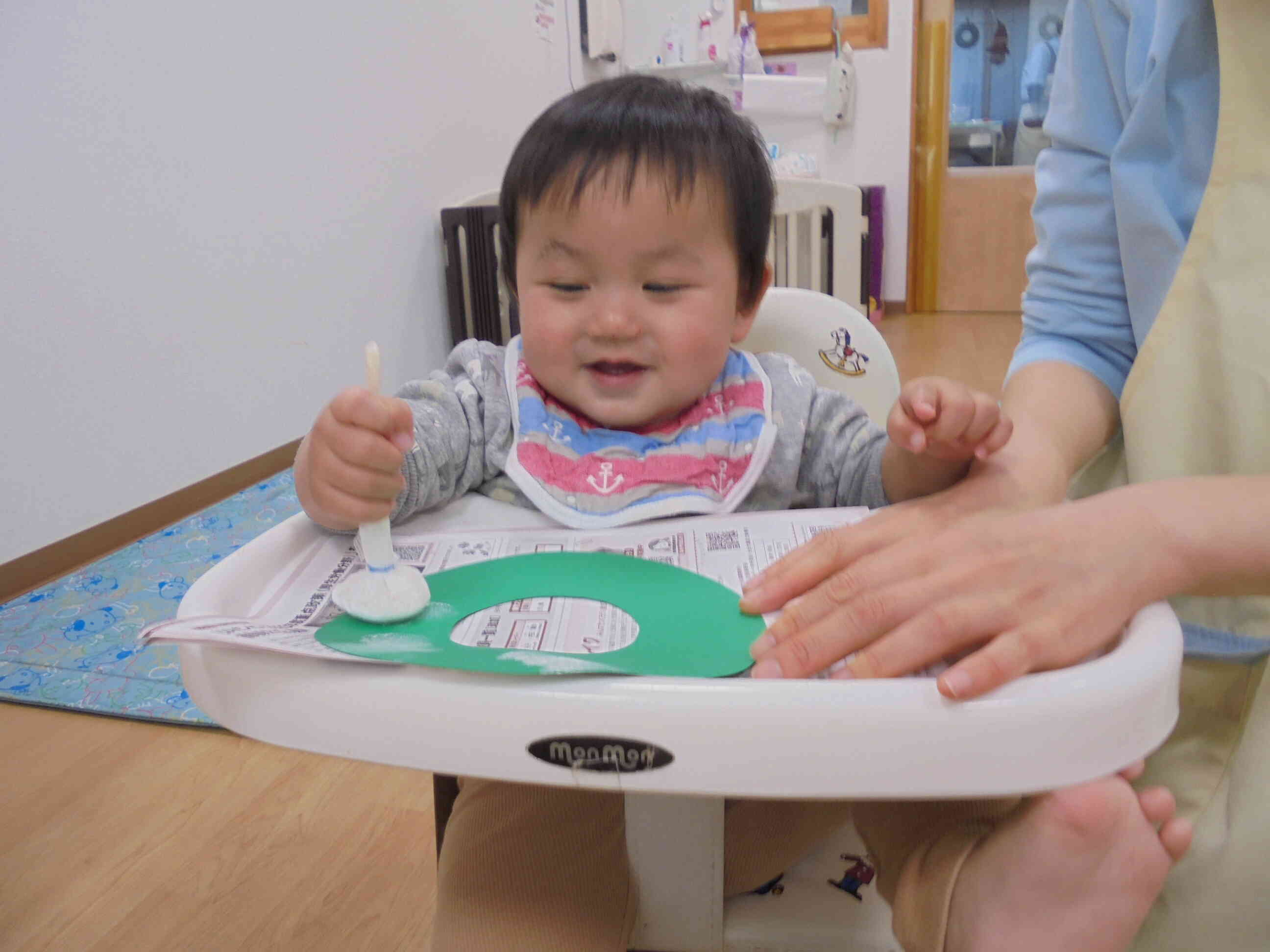 タンポでポンポンと不思議そう表情を浮かべながらも、できると嬉しそうな笑顔を見せてくれました。製作にみんな前向きで他のお友達がやっていると”なんだろう?”と覗きに来てくれます。絵の具にも慣れてきましたね!