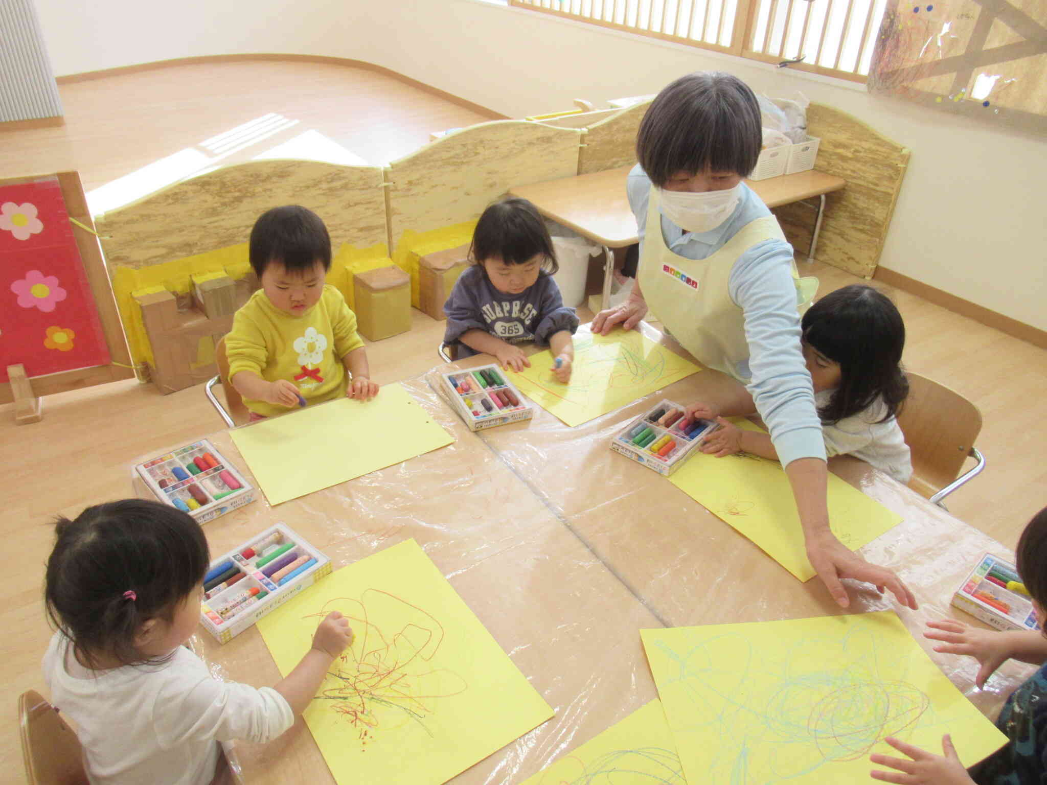 好きなクレヨンを持って大きな紙にたくさん描きましたよ!