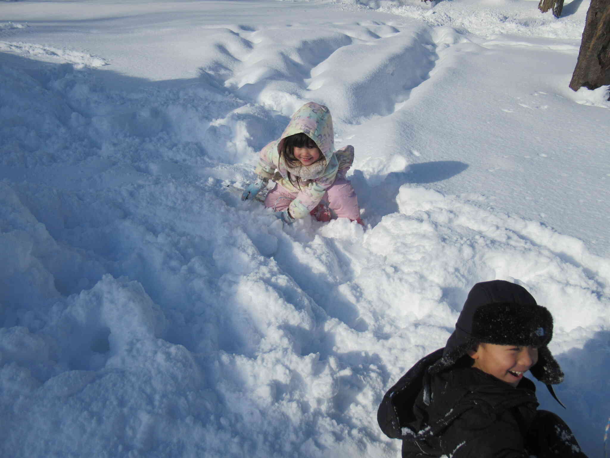 公園には雪がどっさりと積もり、幼児クラスはそり滑りを楽しみました!