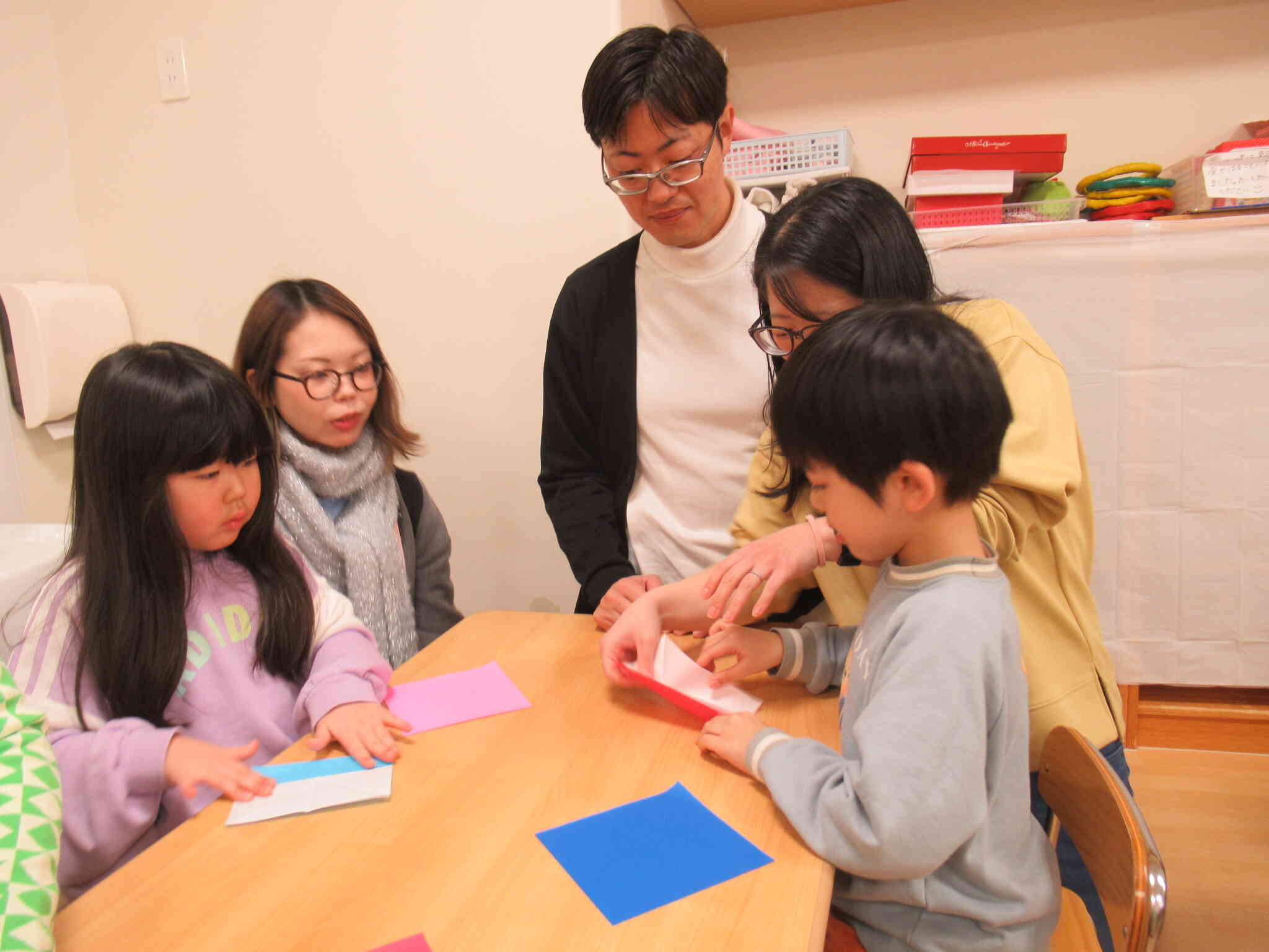 4歳児はお父さん、お母さんと一緒に折り紙を折りました。