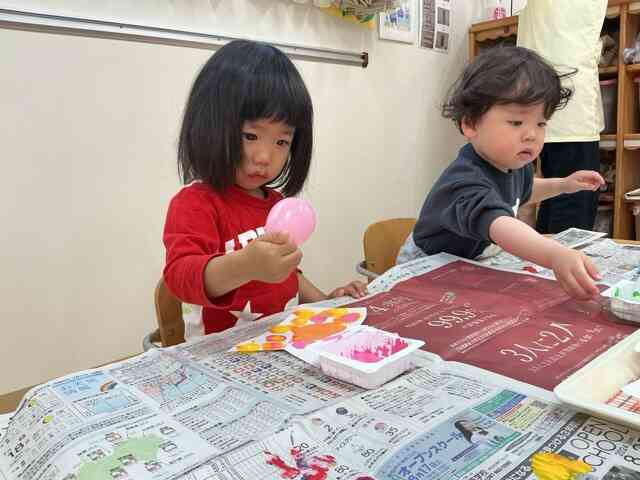「ピンクにする!」「あお!」と好きな色を使ってポンポンとスタンプをしました。