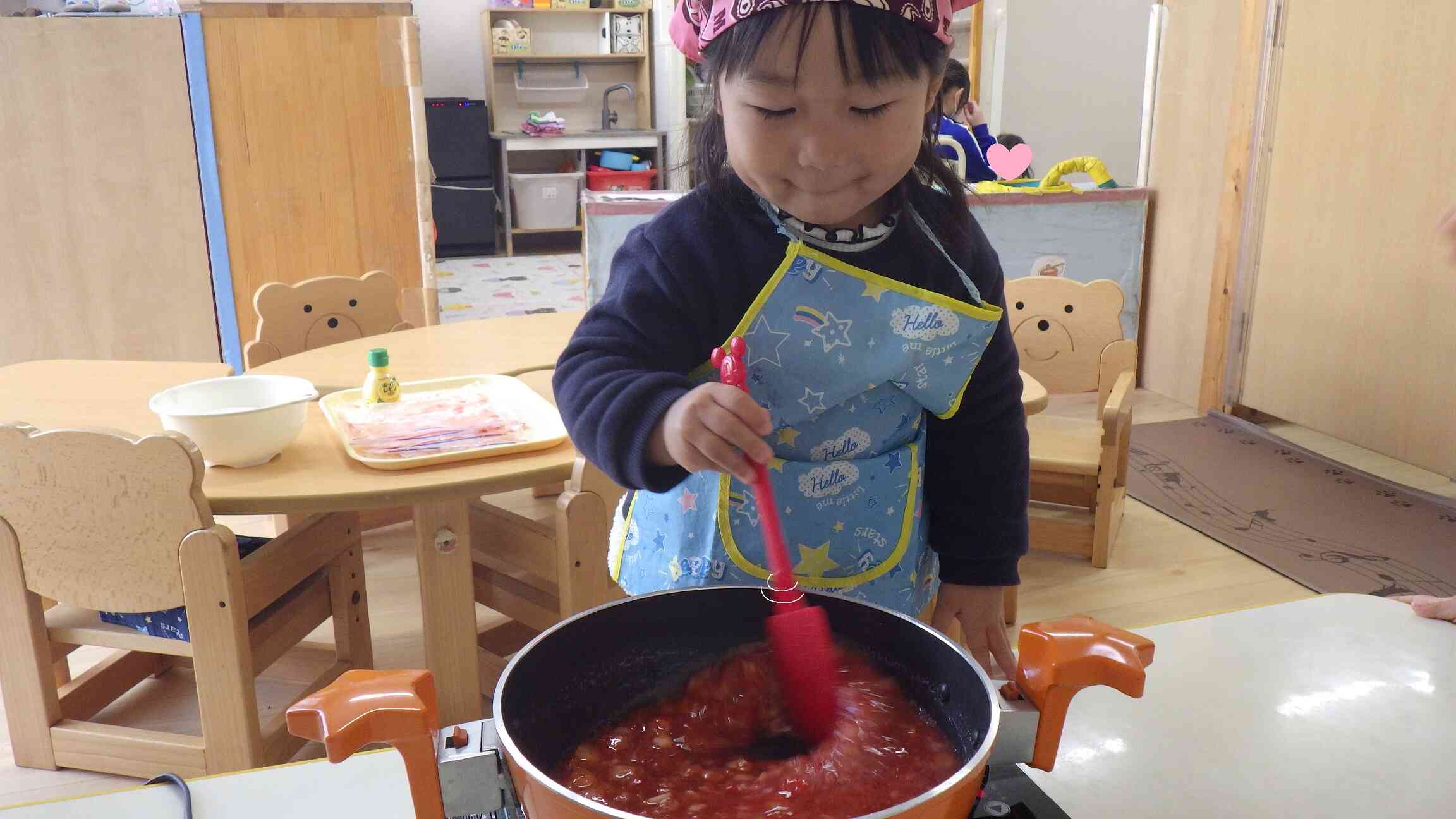 煮る作業は、りんご組さん(2歳児)たちと