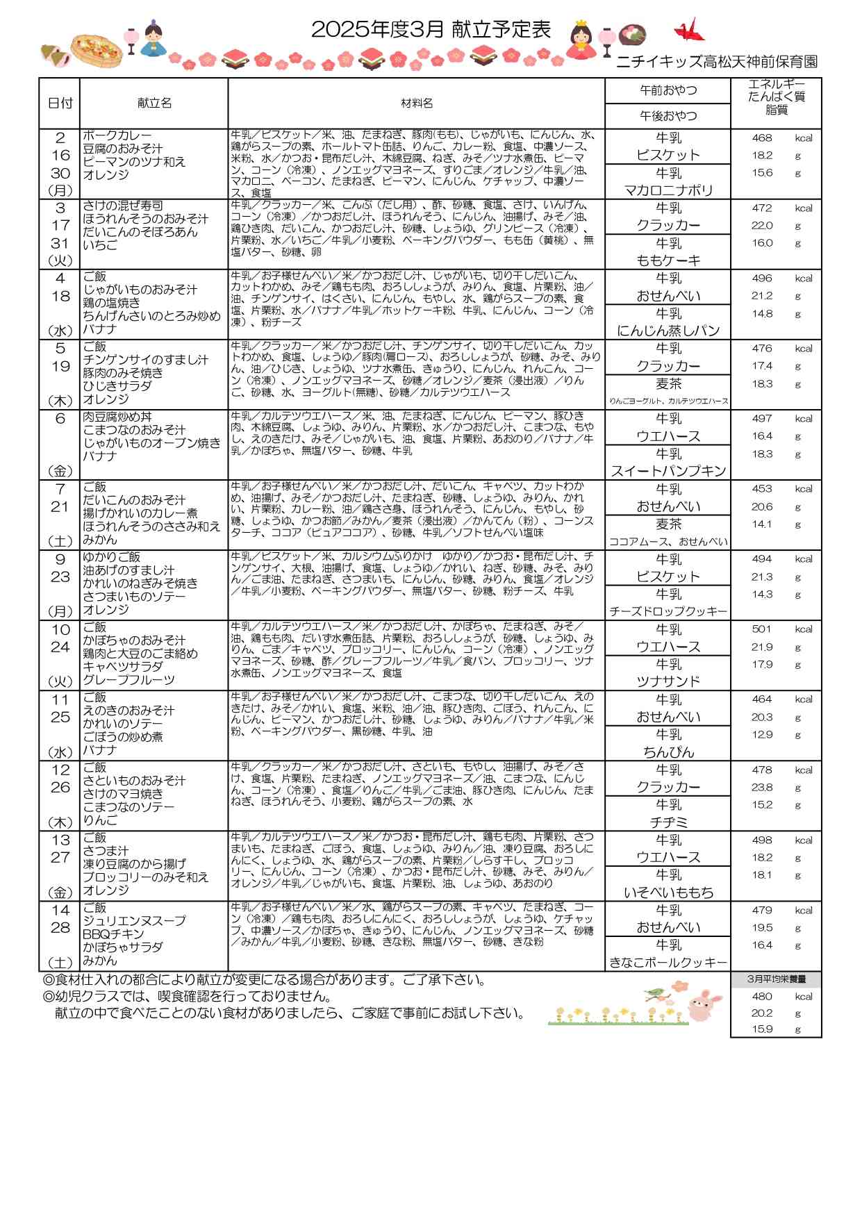 献立表3月号(幼児食)