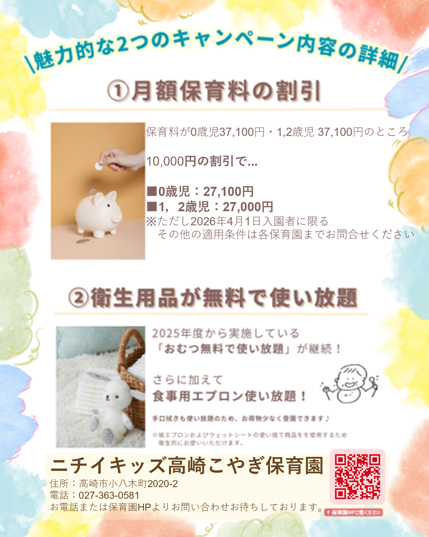 さらに、2026年度からは新たに紙エプロンとその他衛生用品の無償提供も追加し、より衛生的で快適な保育環境を整えてまいります。