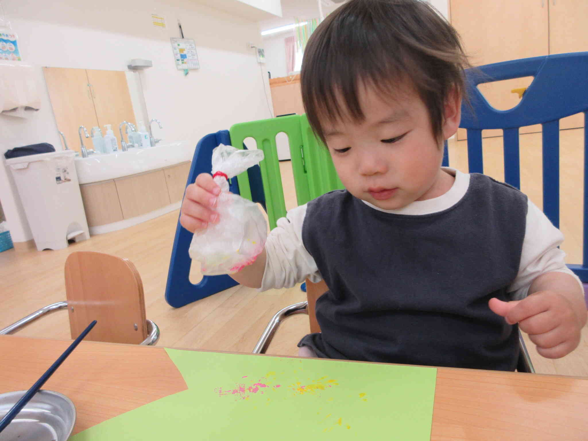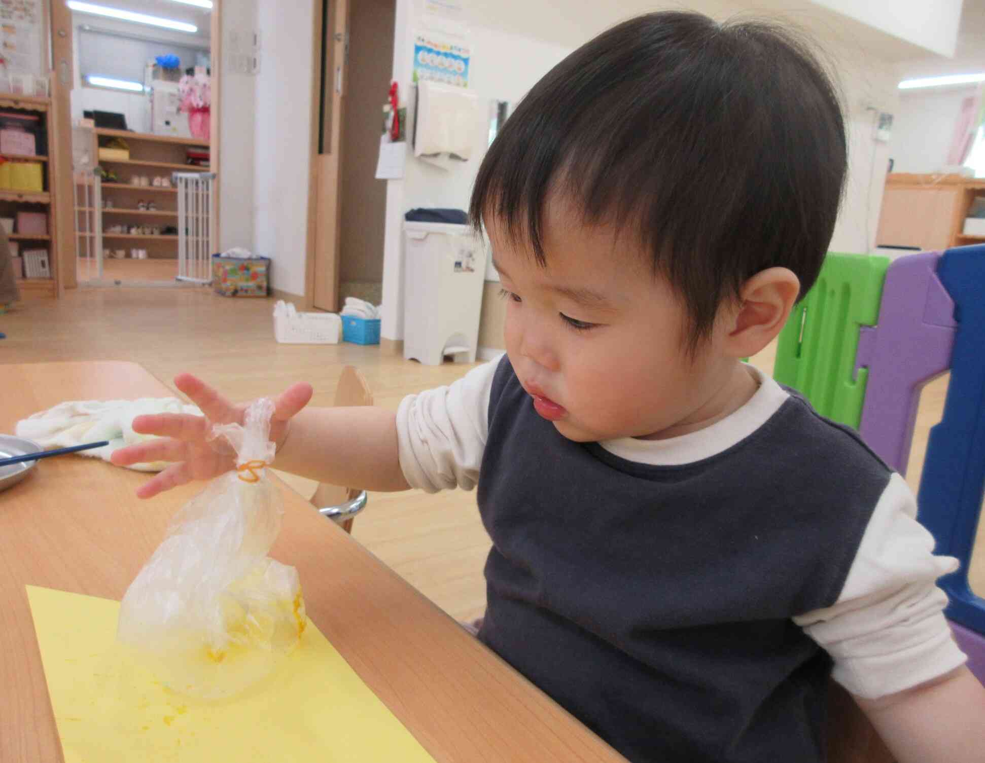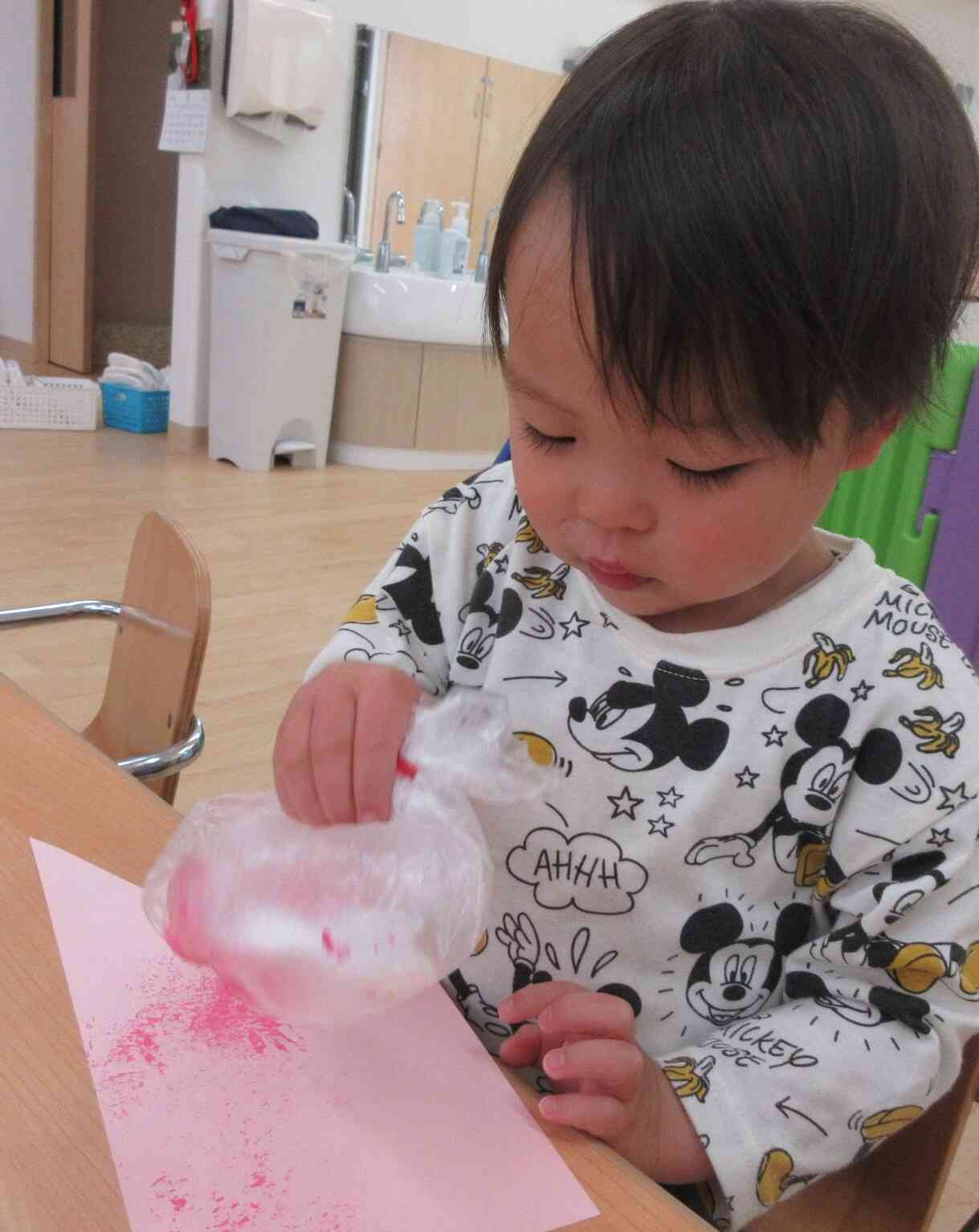 模様がつくのが不思議だったようで、画用紙とビニール袋を交互に見比べながらニコニコと製作に取り組んでくれましたよ(*^^*)