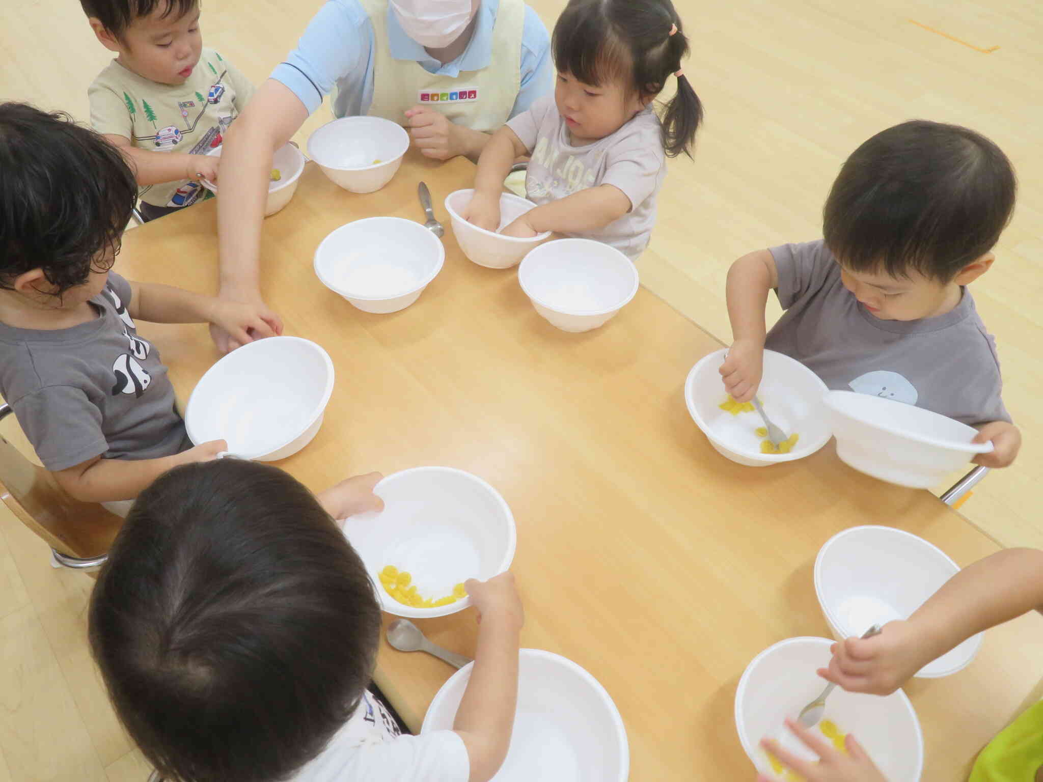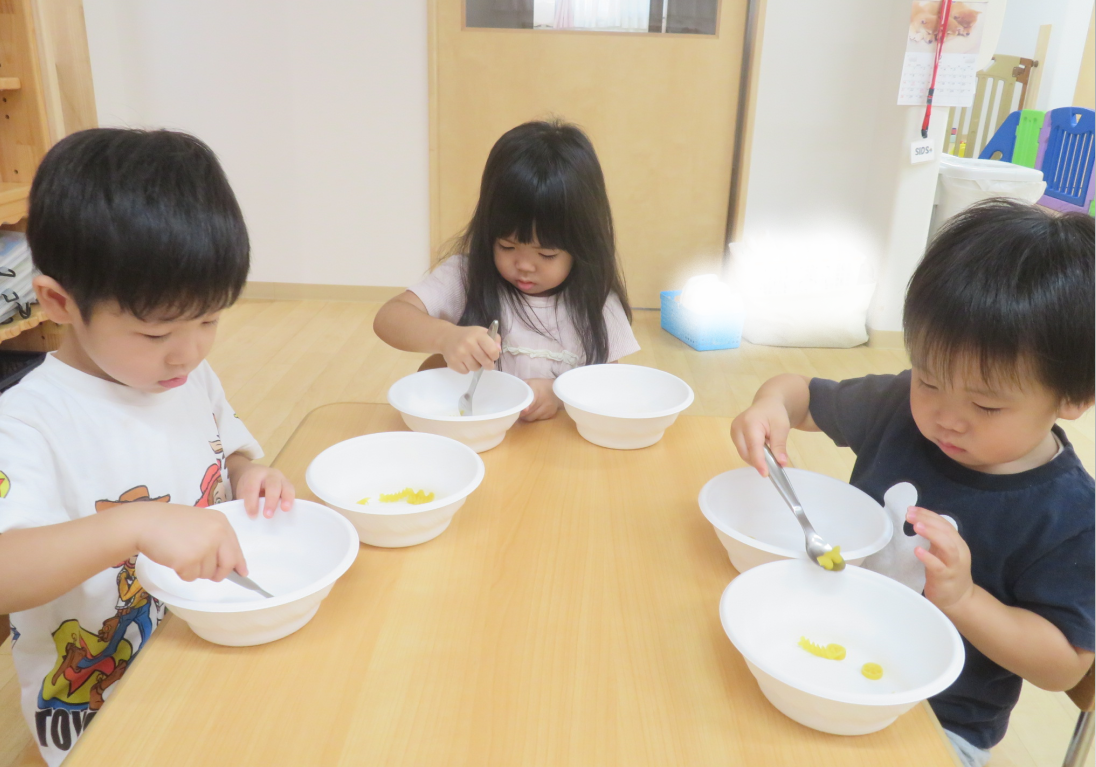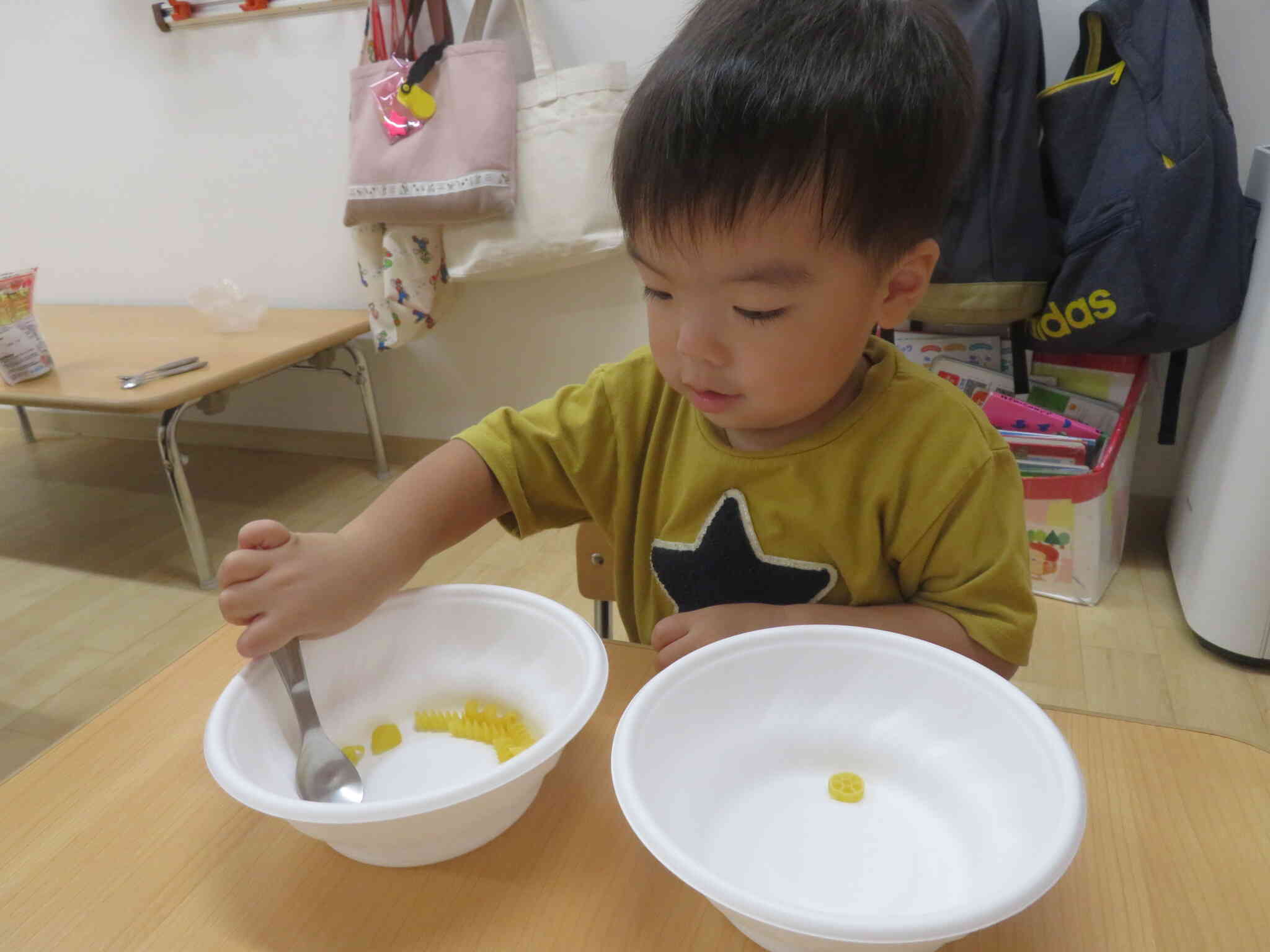 容器に入ったいろいろな形のマカロニをスプーンですくってお皿に移しかえす遊びでは「上手にできたよ♪」とニコニコしながら楽しんでいました(*^^*)