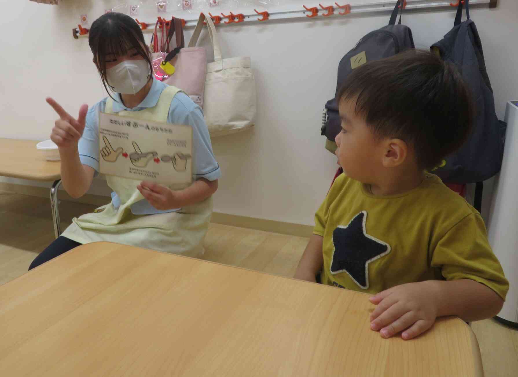食育で『スプーンの正しい持ち方』について教えてもらいました。