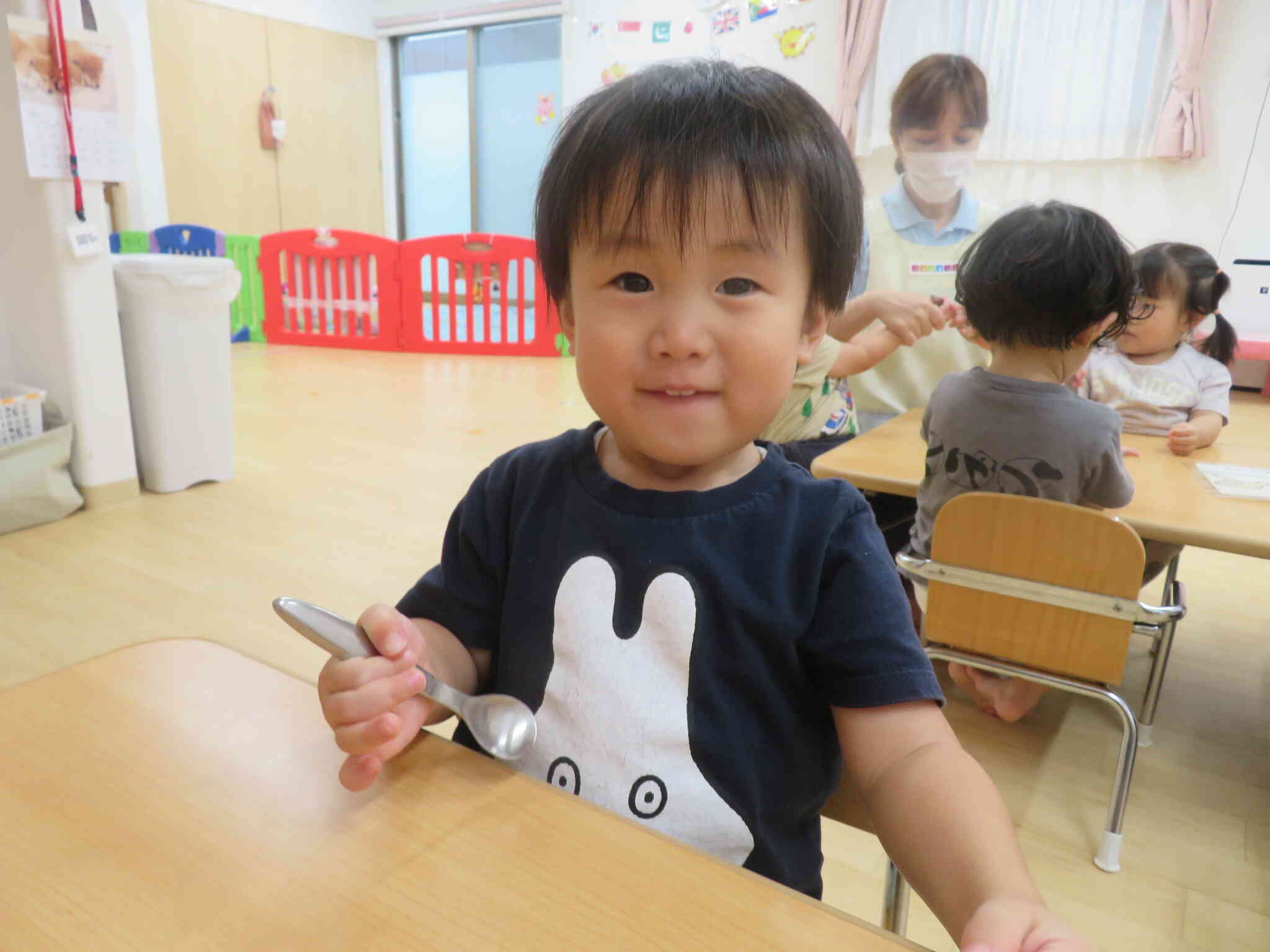 鉄砲のように親指と人差し指でスプーンを持つことを伝えると、一生懸命指を広げようと頑張ってスプーンを持っていました!