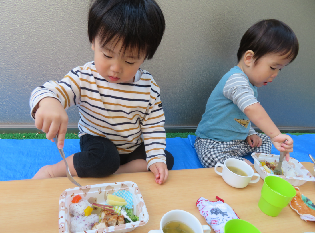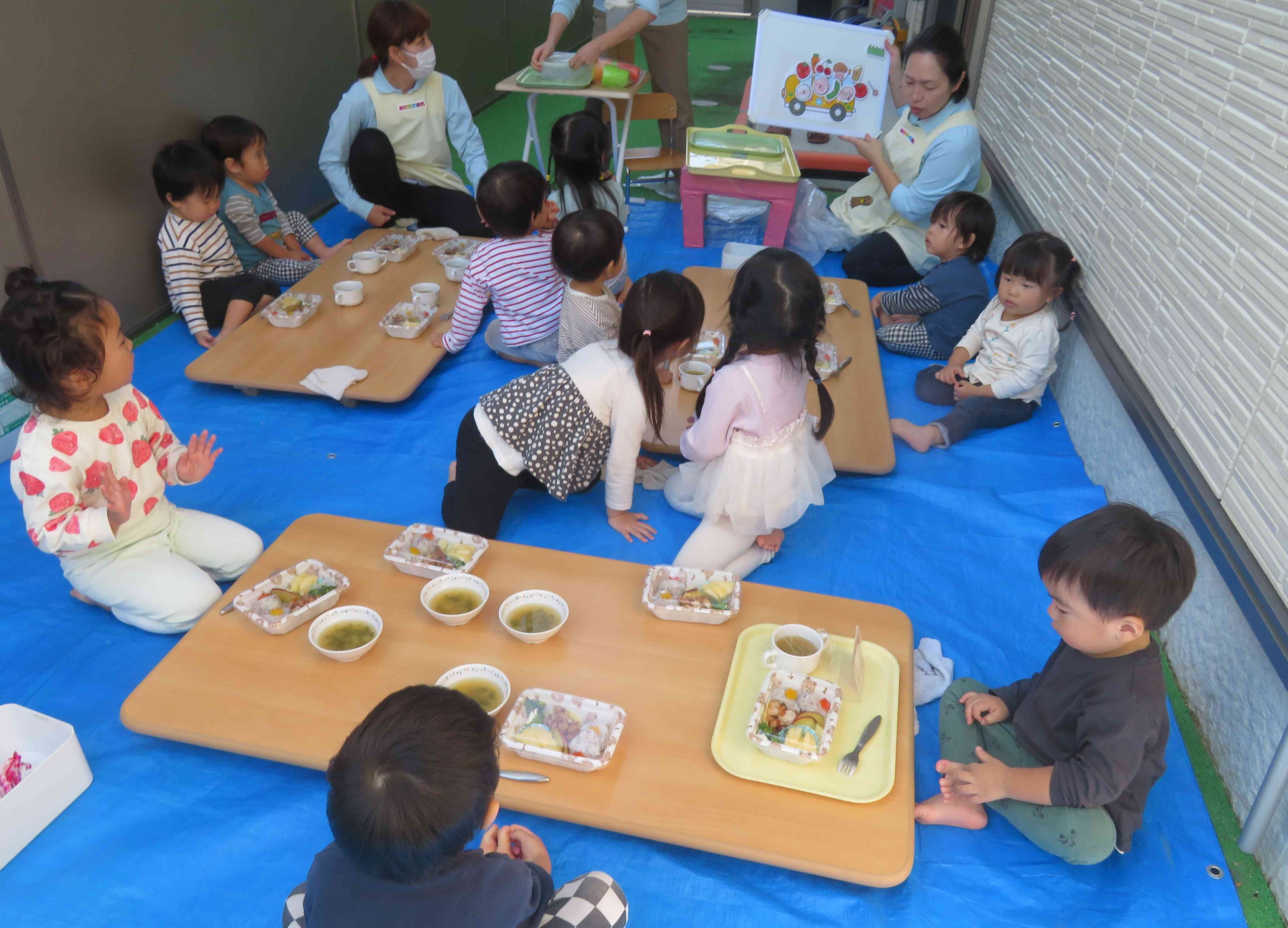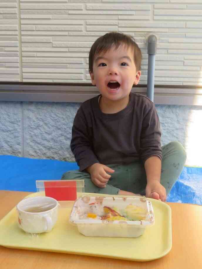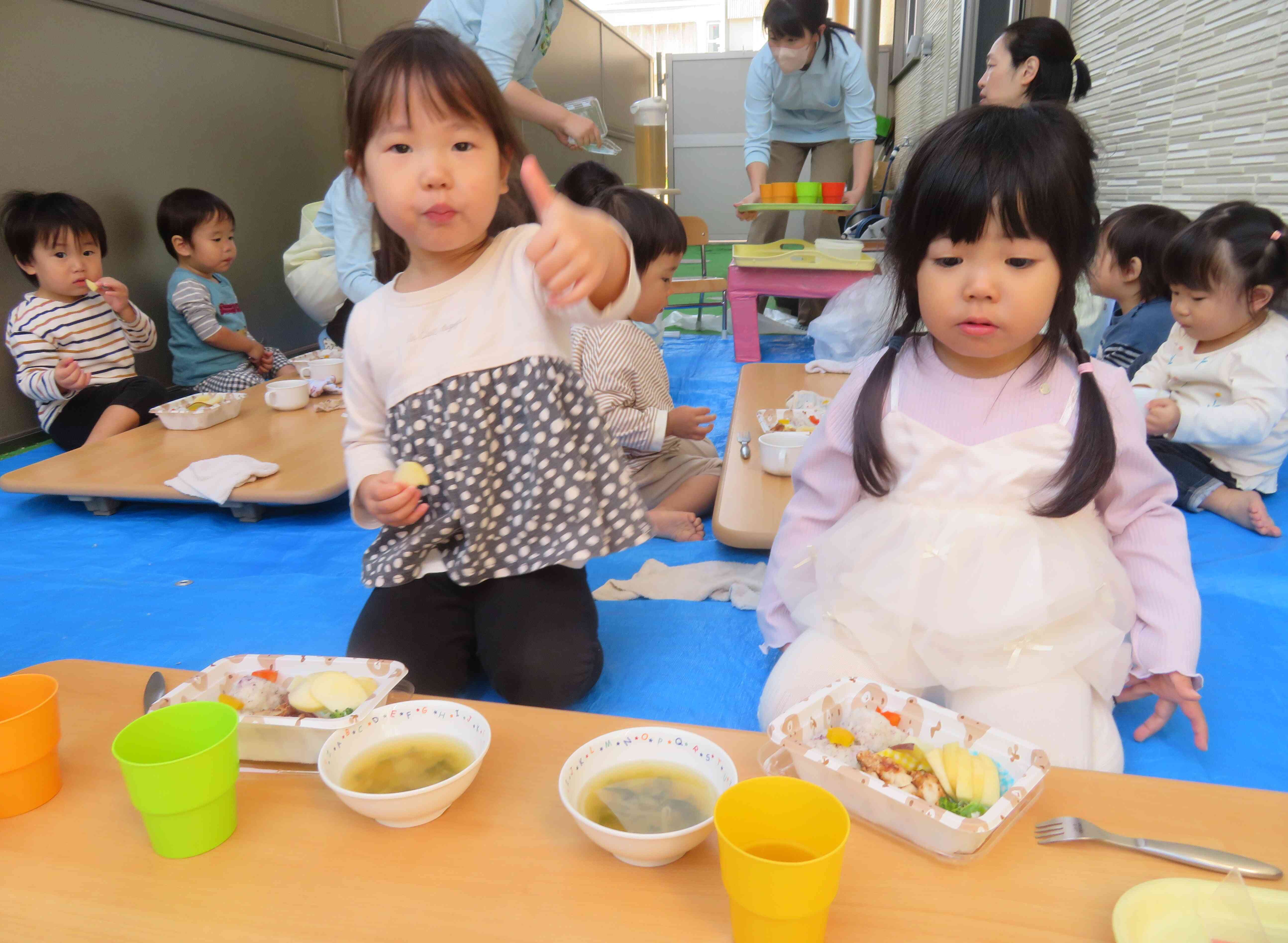 秋のとてもいい気候の中、テラスでお弁当給食を食べました!