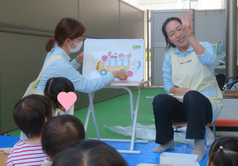 「お弁当バス」のパネルシアターを見たり、お弁当箱の歌に合わせて手遊びをした後…