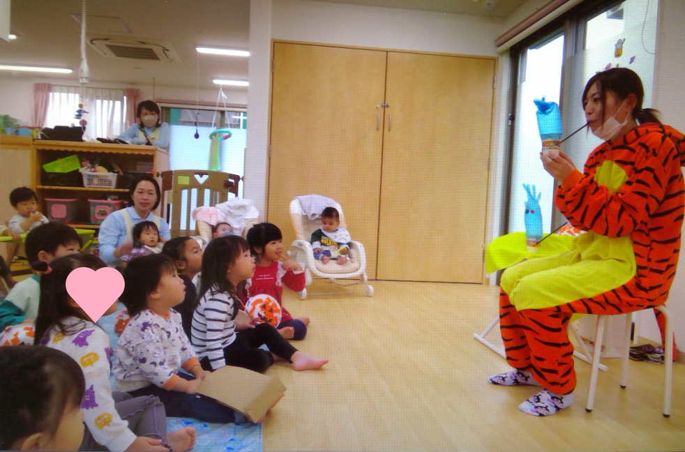 手袋を膨らませると可愛いおばけが出てくる出し物や絵本も興味津々で見ていました(*^^*)
