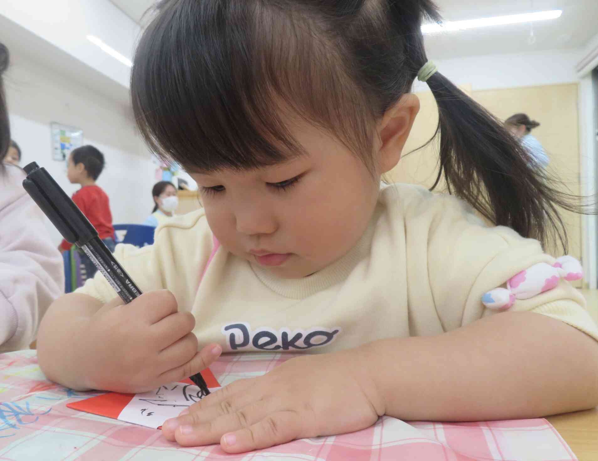 折り紙のサンタクロースの顔に、目と口を描いてもらうと「お目目だよ〜」と言いながら上手にペンを持って描いていましたよ!