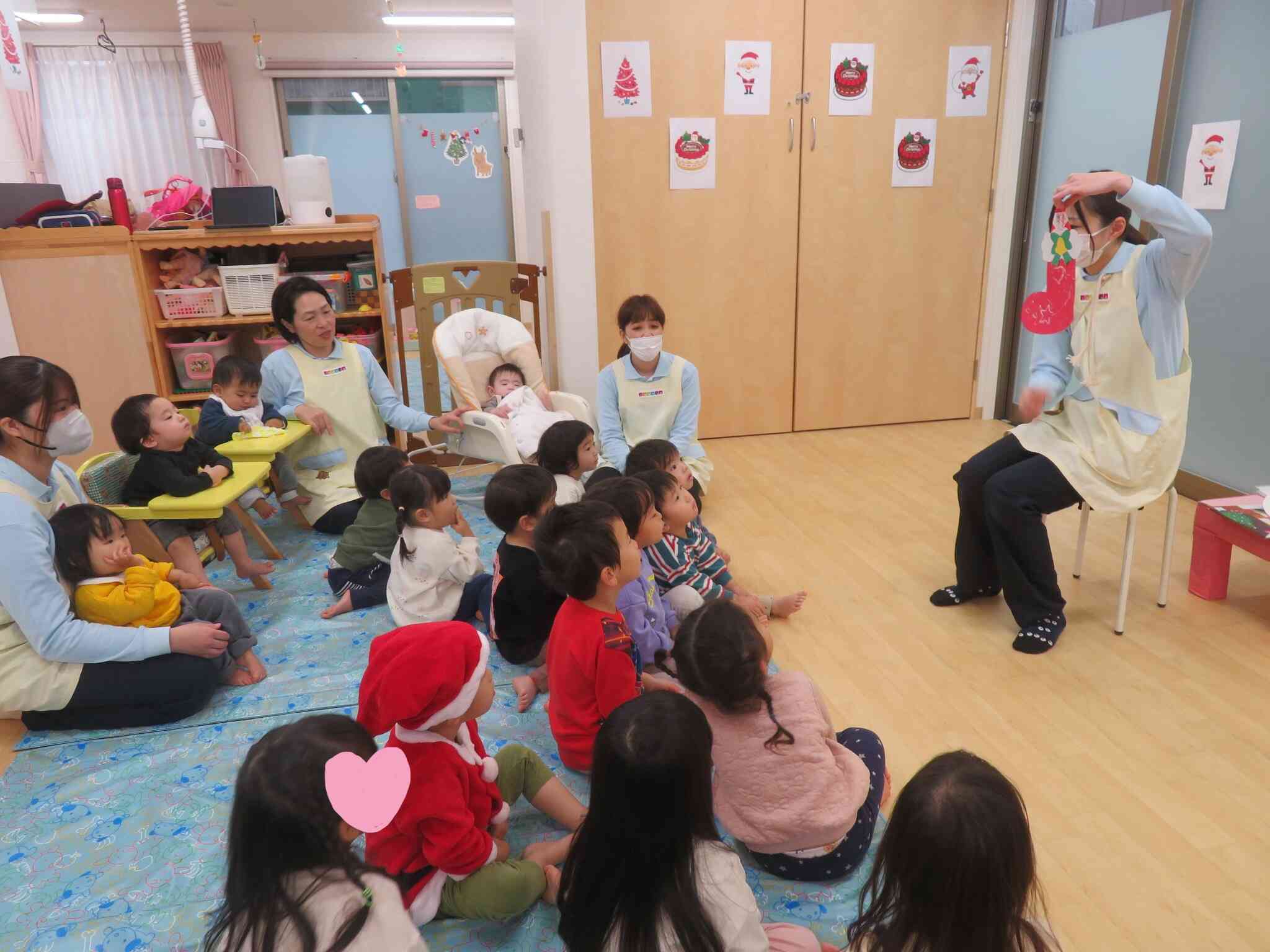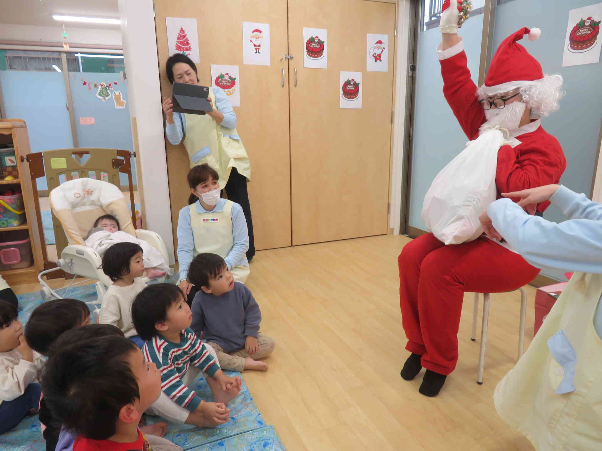 みんなでお歌を歌っていると…ピンポンとインターホンが鳴りました。サンタクロースがチラッと見えて「サンタさんかな!?」とワクワク!!