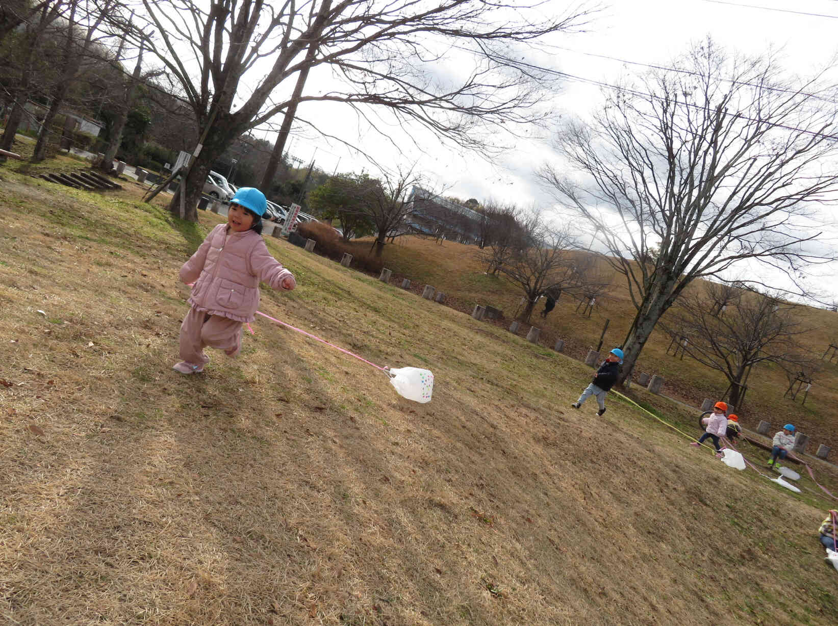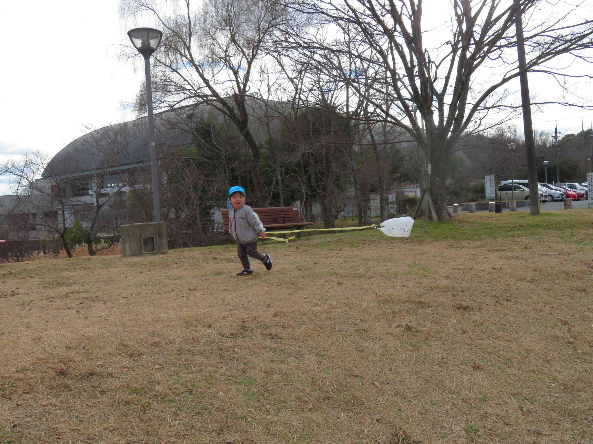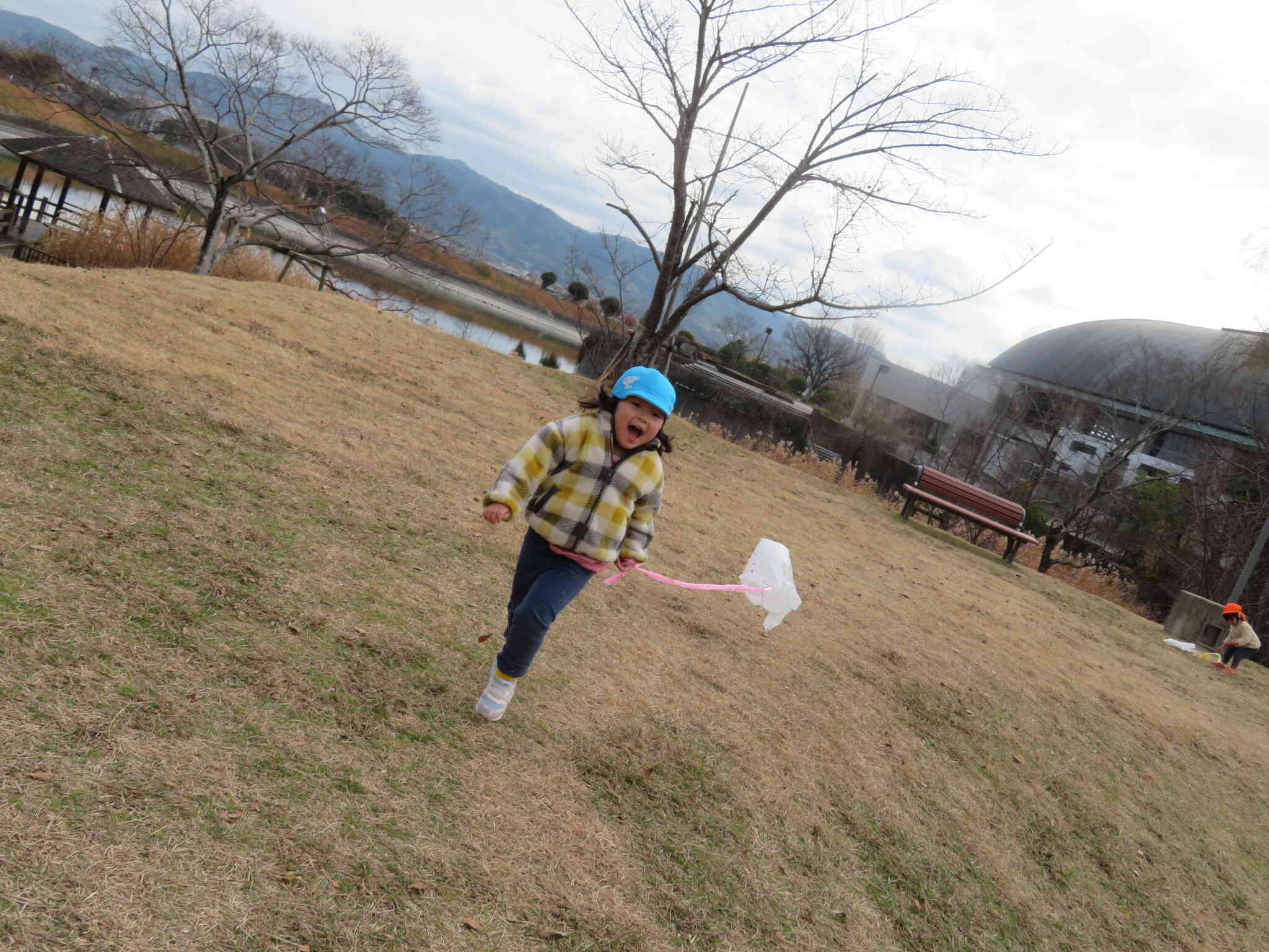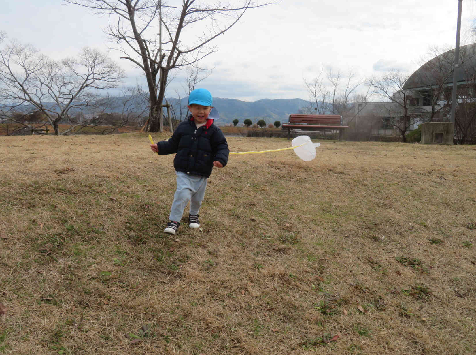 最初は「全然飛ばないよ〜」と言っていましたが、「いっぱい走ったら高く飛ぶよ!」と先生にアドバイスをもらうと、一生懸命走って凧揚げを楽しんでいました♪