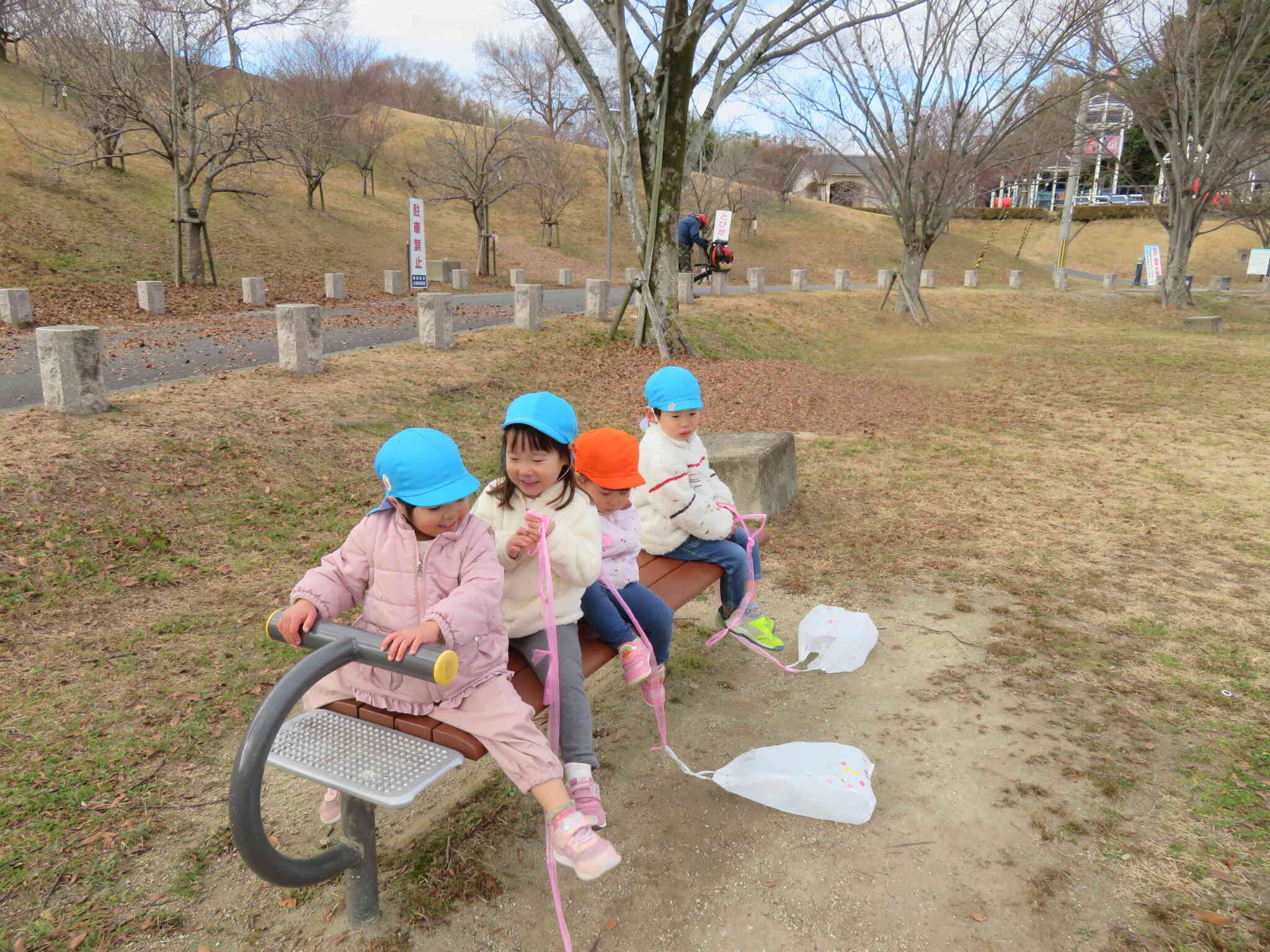 公園では、ビニール袋に好きなシールを貼り付け自分たちで作った凧で「凧揚げ」をして遊びました。
