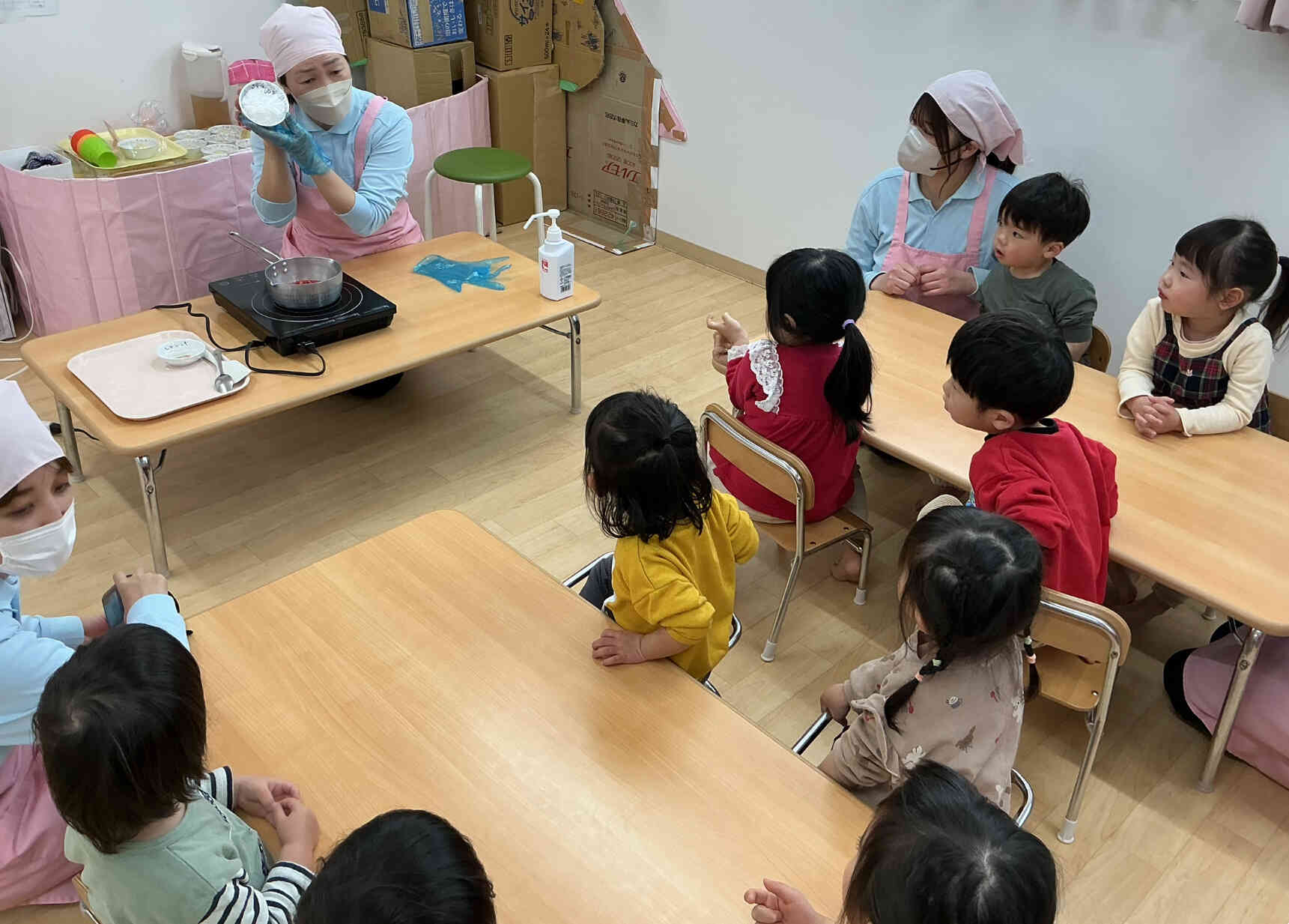 まずは、袋に入れたいちごを1人ずつ手で潰してもらいます。次に、潰したいちごと砂糖を鍋に入れてぐつぐつ煮ます。