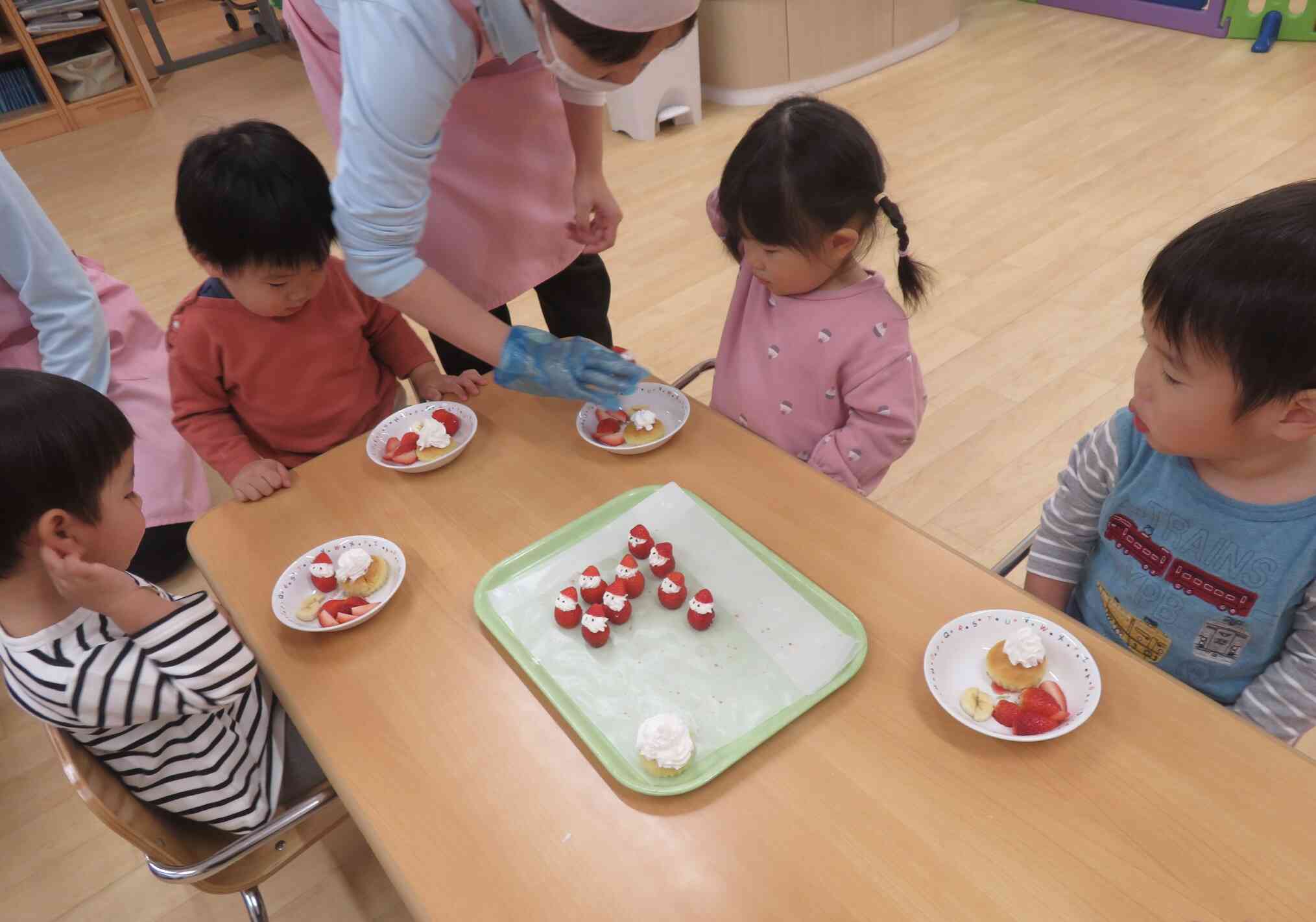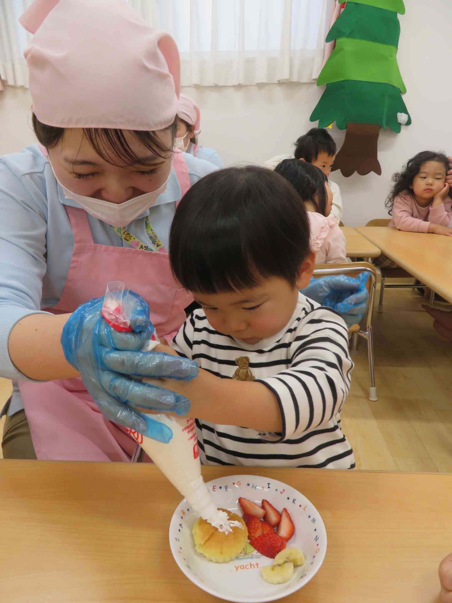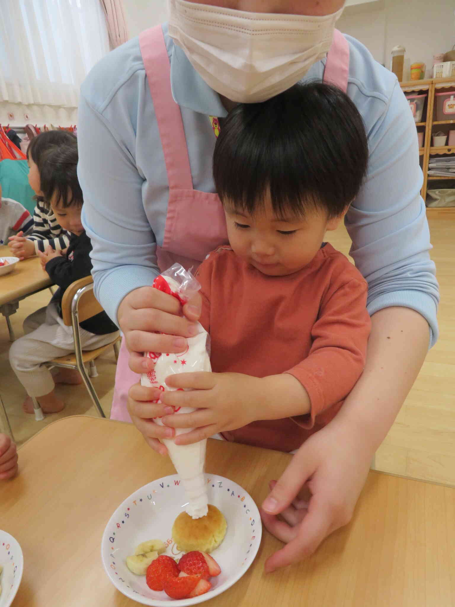 うさぎ組(2歳児)・あひる組(1歳児)さんは、カップケーキに自分たちで生クリームを絞り、フルーツをトッピングして可愛くデコレーションしてくれましたよ!