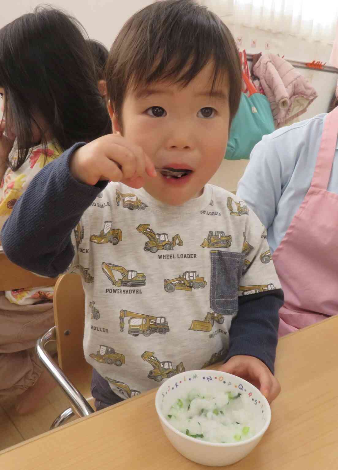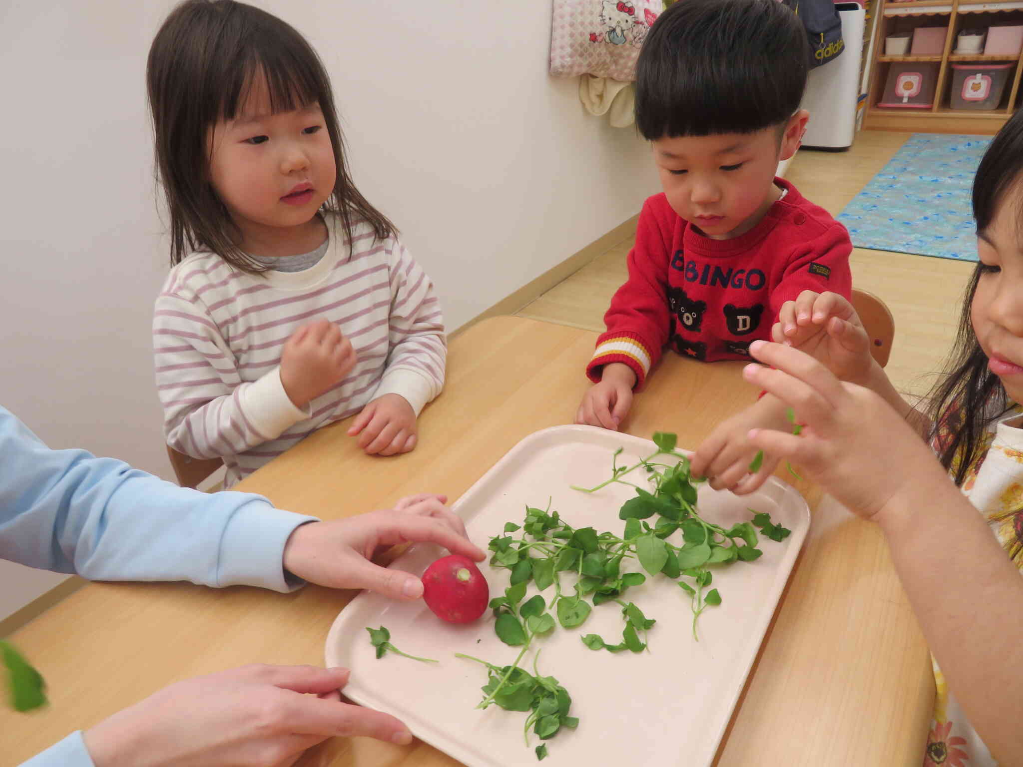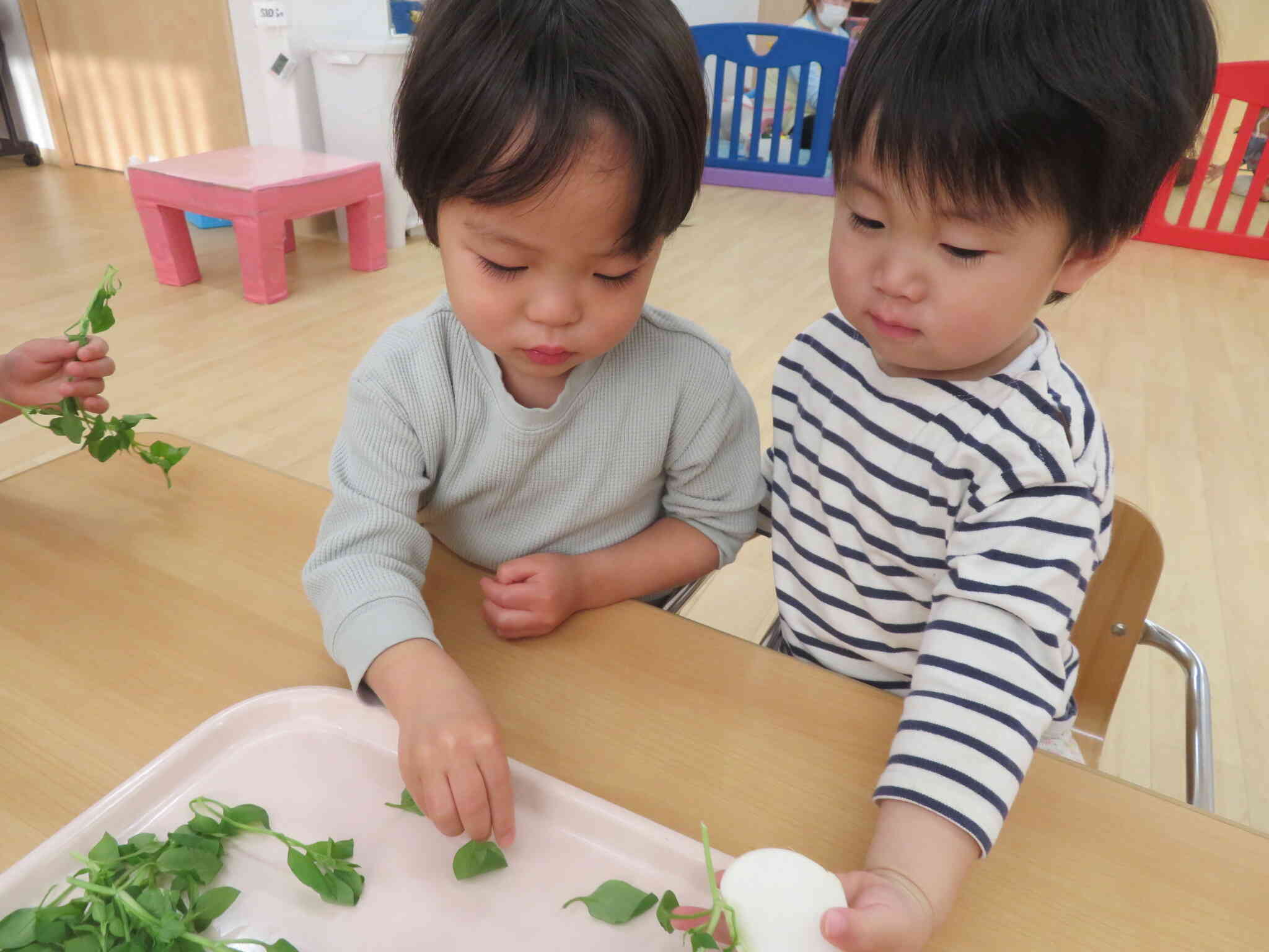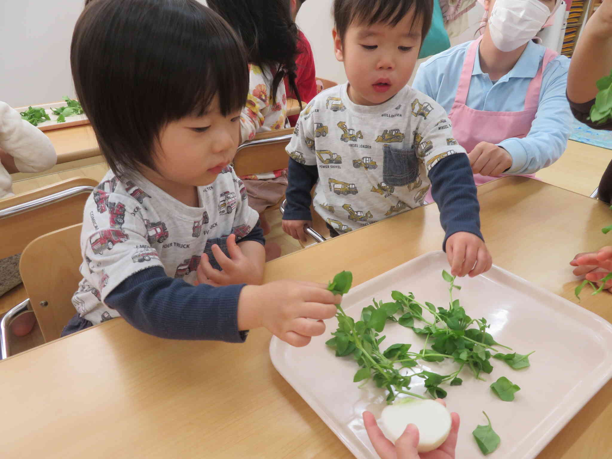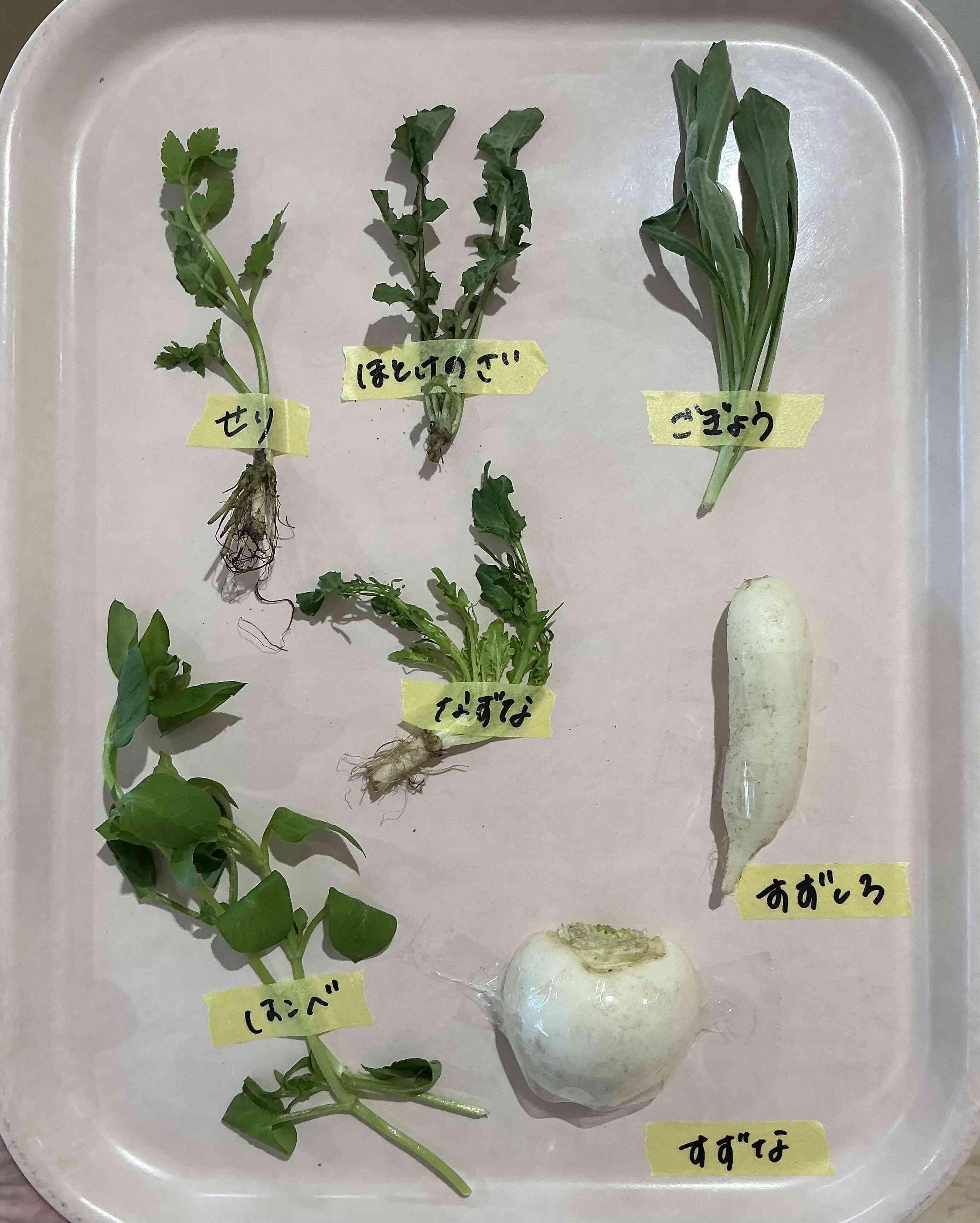 春の七草について先生のお話を聞いた後は、実際に触ってみます。