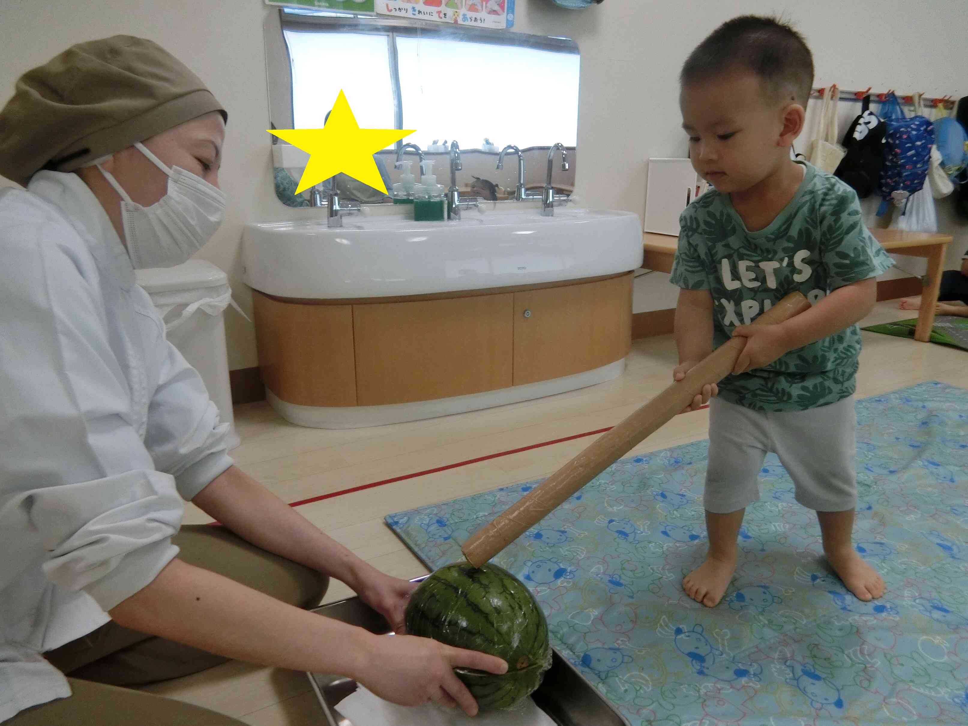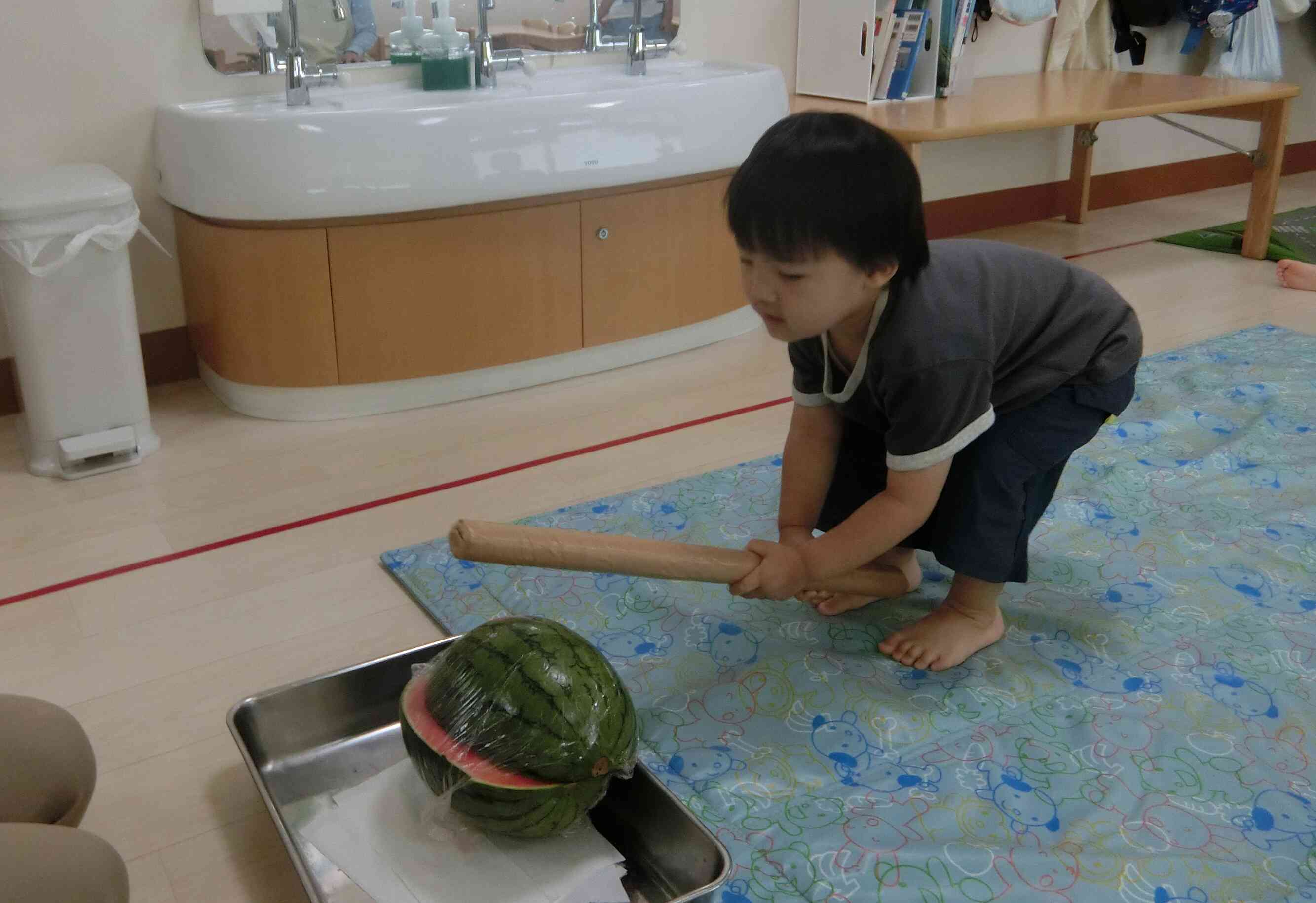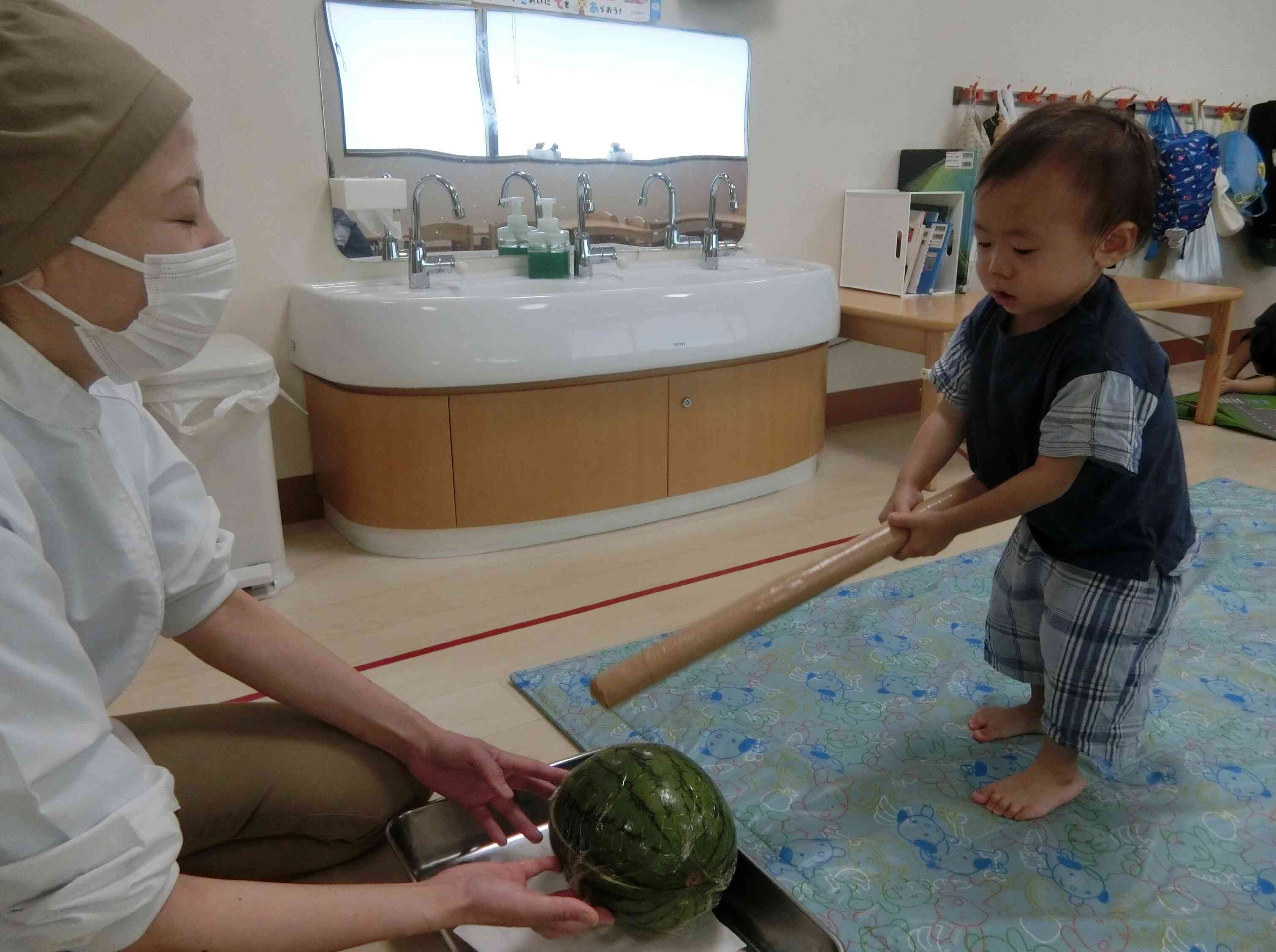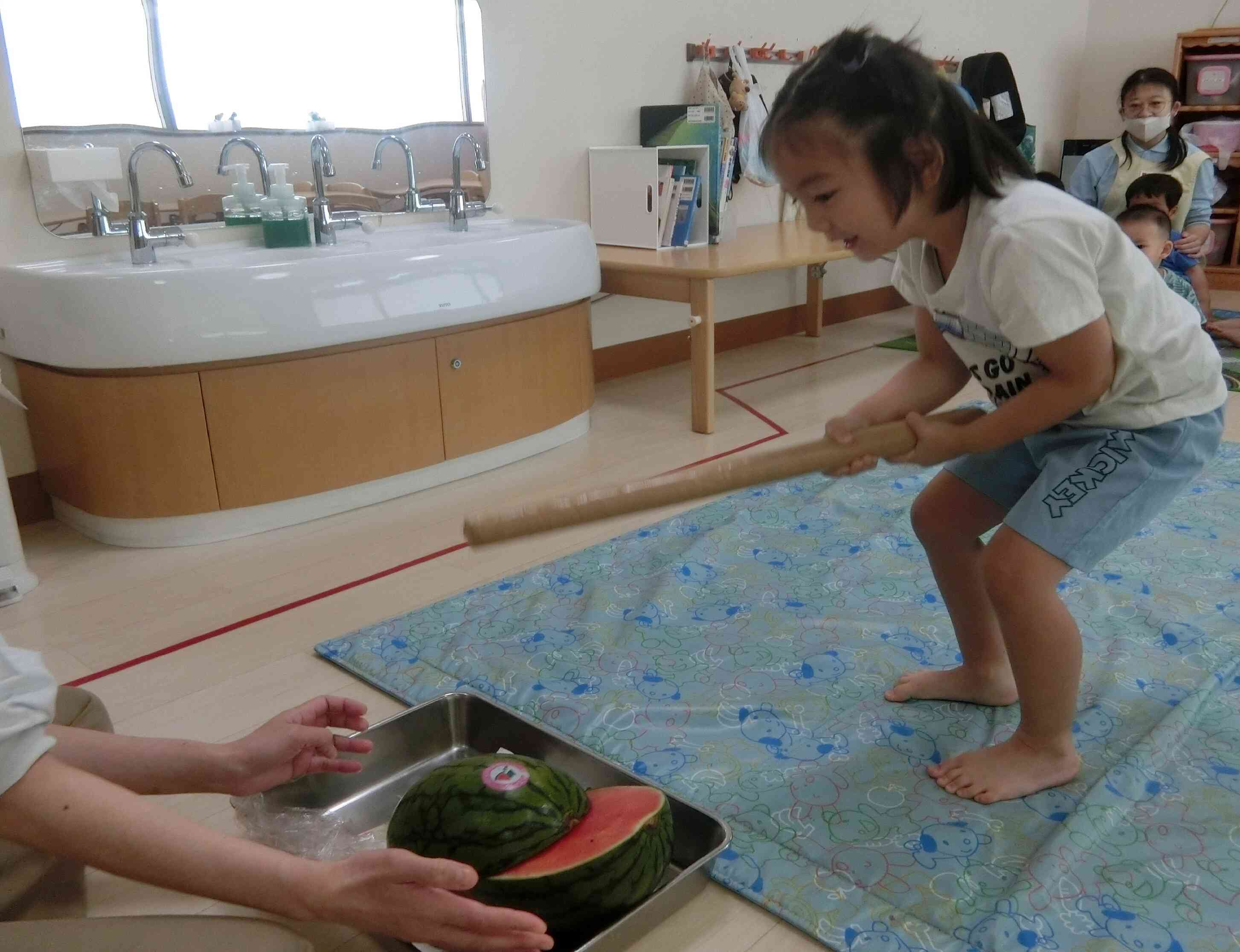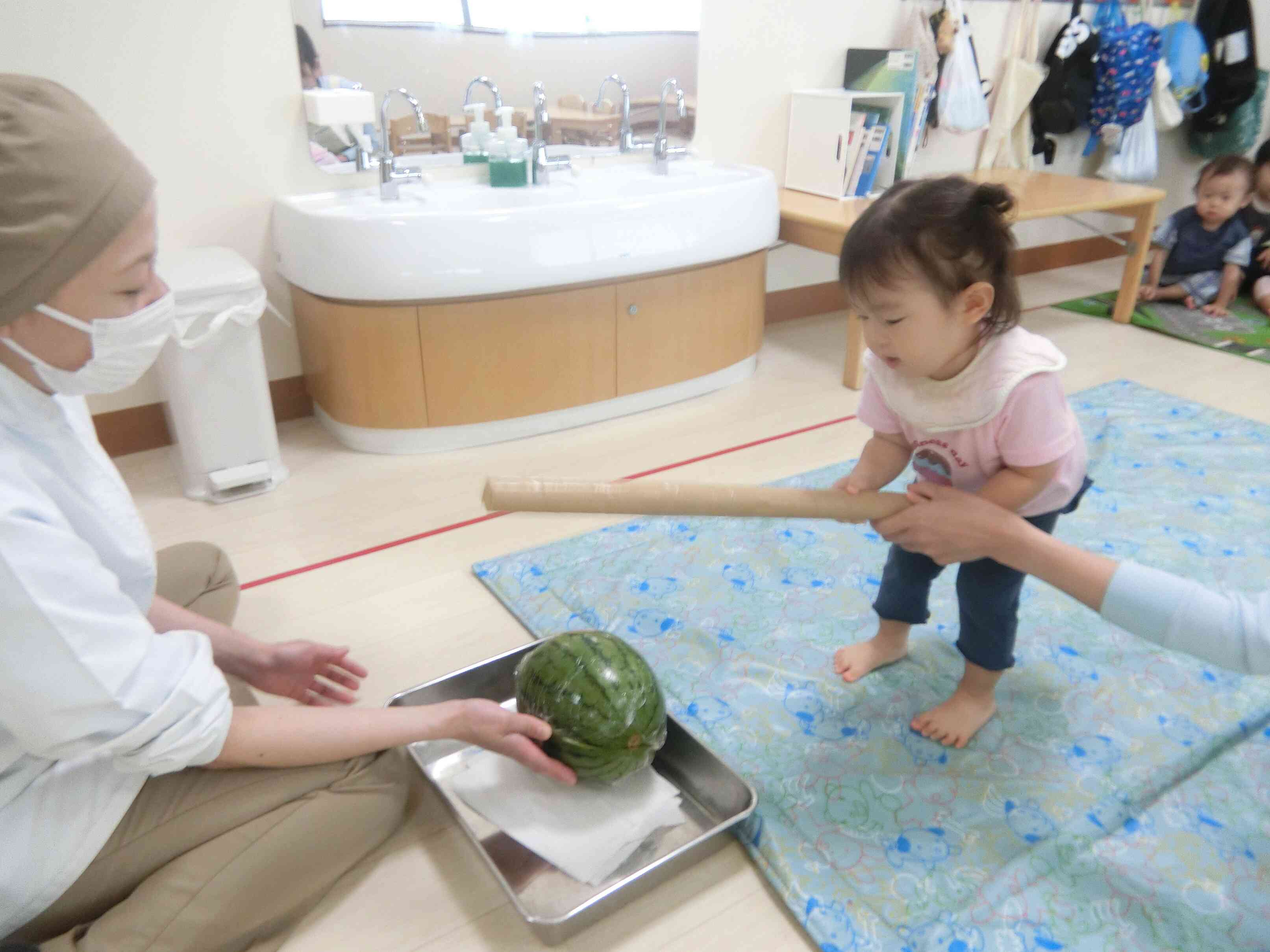 丸いままのスイカを見るのが初めてのお友達もいて、みんな興味津々!