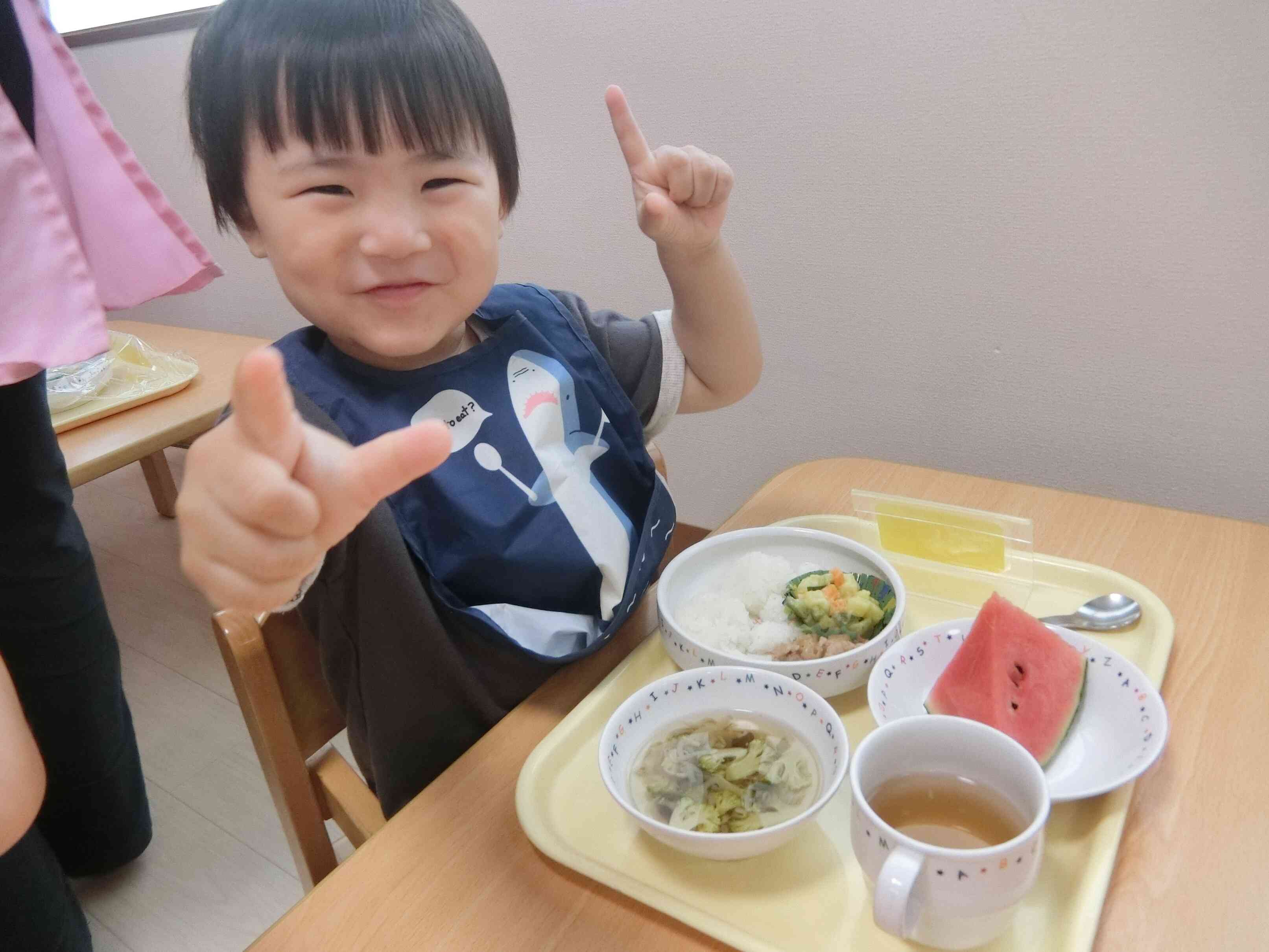 給食の先生に目の前で切り分けてもらい、好きな大きさのスイカを選んで食べました♪